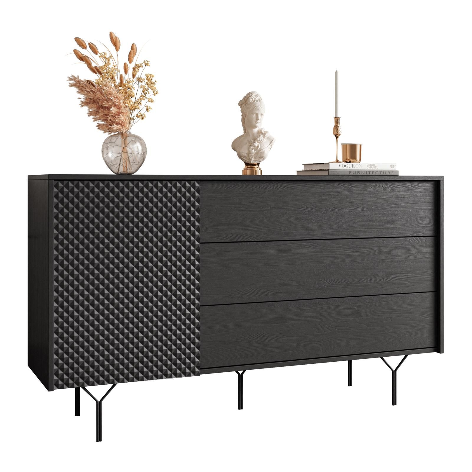 Jedes Möbelstück der Richmond-Kollektion besticht durch sein einzigartiges Design und die Liebe zum Detail. Die elegante schwarze Farbe der Konstruktion, kombiniert mit den 3D-gefrästen Fronten, schafft ein außergewöhnliches Muster, das den Möbeln Charakter und Einzigartigkeit verleiht. Diese Kollektion bietet nicht nur optische Schönheit, sondern auch praktische Lösungen für die Aufbewahrung einer Vielzahl von Gegenständen. Bemerkenswert ist, dass die Möbel der Richmond-Kollektion mit einem innovativen Push-Open-System ausgestattet sind. Diese moderne Lösung verleiht den Möbeln nicht nur ein elegantes Aussehen, sondern auch einen minimalistischen Charakter.