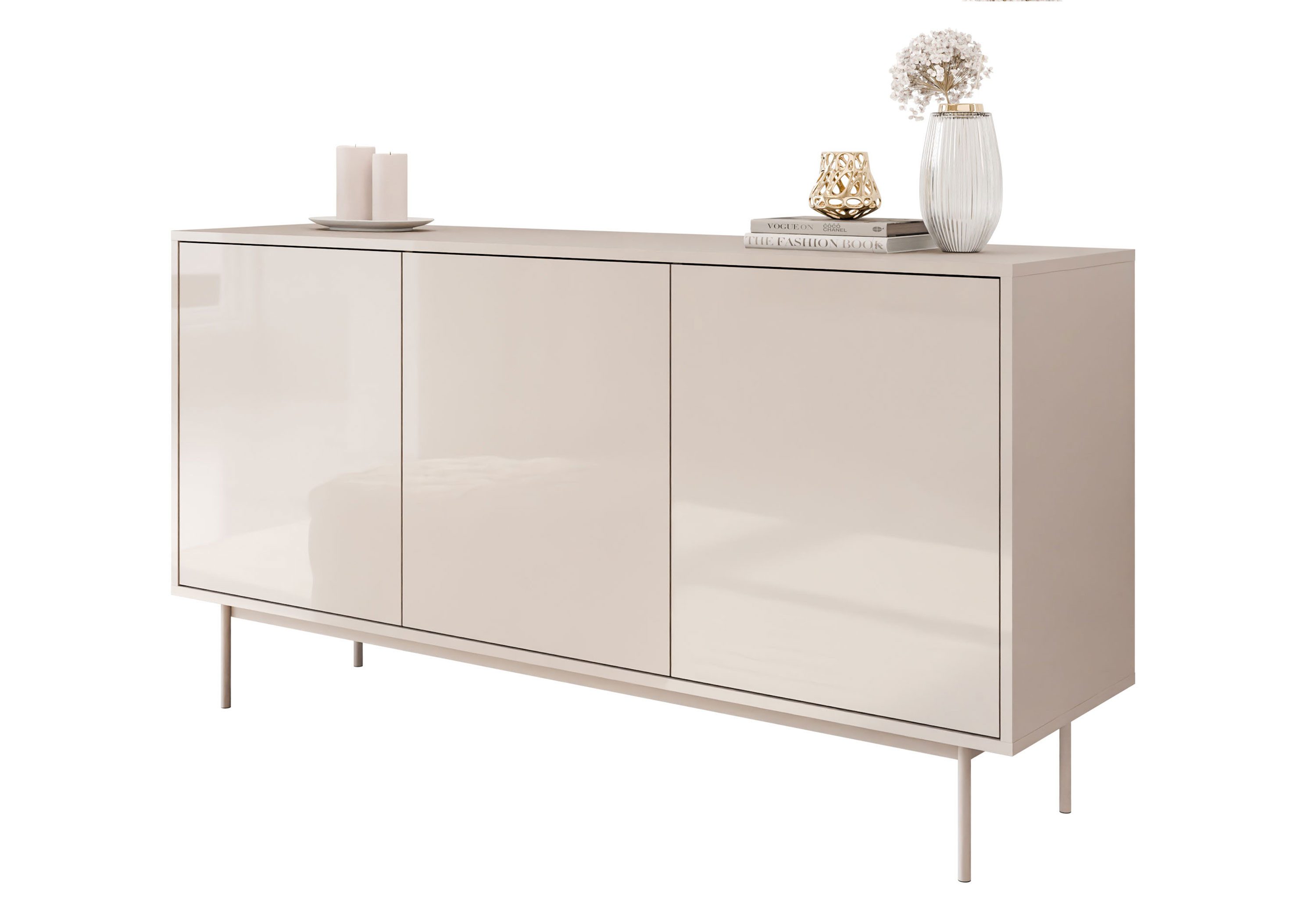 Das Möbelstück besticht durch seine minimalistische Form und die dezente Kaschmirfarbe, die perfekt zu den aktuellen Wohntrends passt. Die Fronten der Kommode sind in Hochglanz ausgeführt und reflektieren das Licht wunderschön, was dem Interieur eine elegante Note verleiht. Der Korpus ist zusätzlich mit einer widerstandsfähigen ABS-Kante versehen, die höhere Widerstandsfähigkeit im täglichen Gebrauch gewährleistet und die Ränder vor Beschädigungen schützt. Dank ihres universellen Designs harmoniert die Kommode sowohl mit modernen als auch klassischen Arrangements.