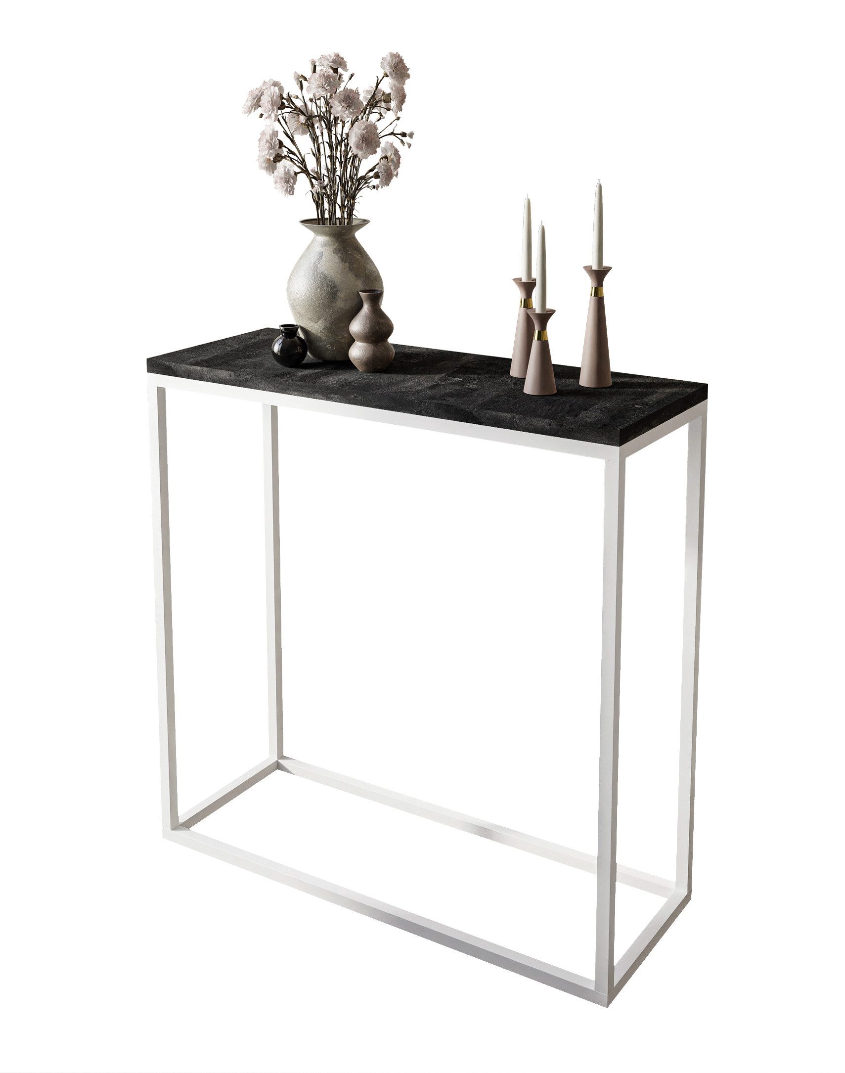 Das Gestell der Konsole besteht aus Metall, was für Stabilität und Langlebigkeit sorgt. Die Tischplatte besteht aus 16 mm starker Laminatplatte in stilvollem Dunkelbeton-Dekor, die in Kombination mit einem schwarzen oder weißen Gestell ein elegantes, harmonisches Gesamtbild erzeugt.