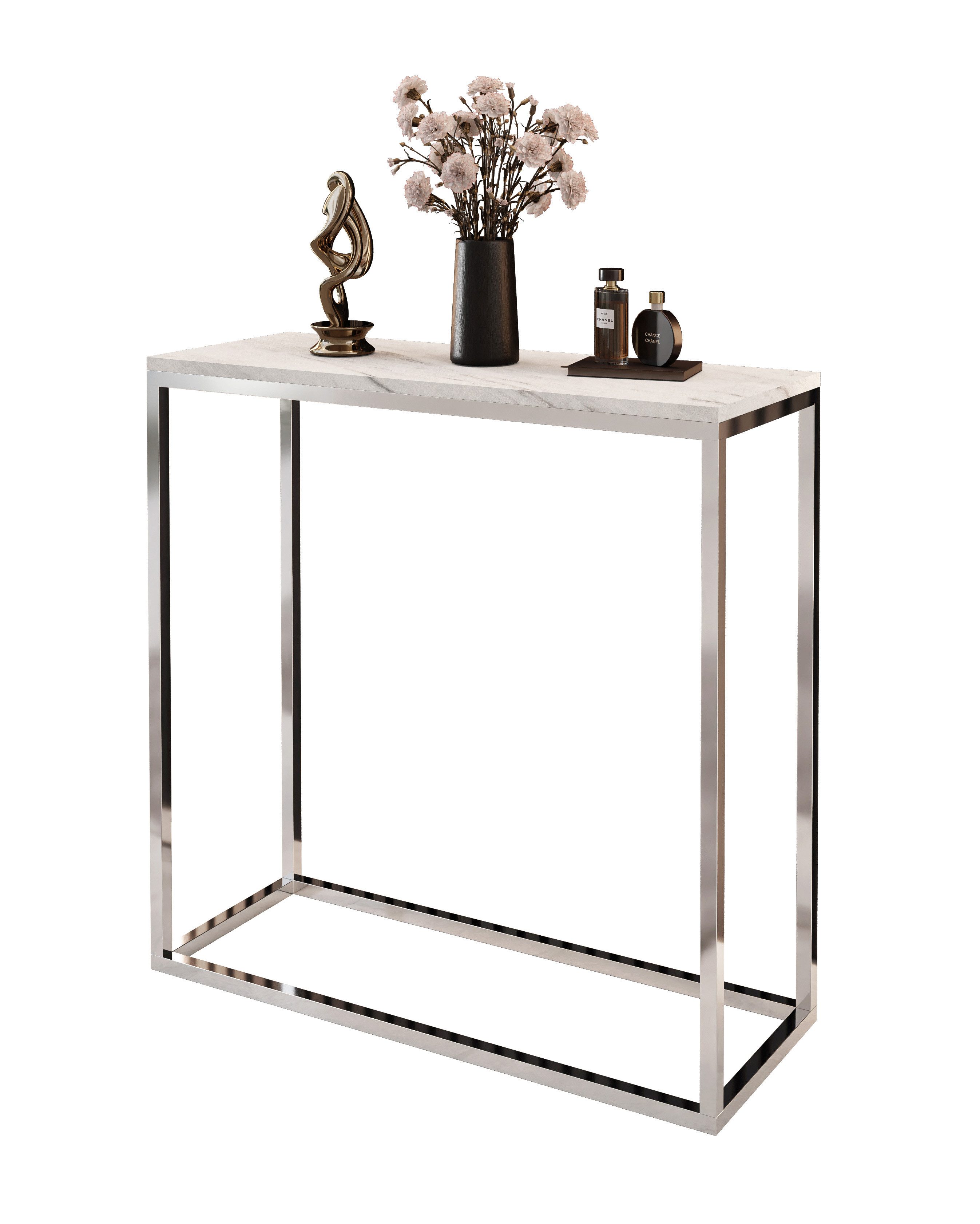Die großzügige Form der Basis verleiht dem Produkt visuelle Leichtigkeit und überlastet so den Raum nicht. Das Möbelstück zeichnet sich durch hohe Langlebigkeit aus und wird dem Käufer dank der Verwendung von Materialien höchster Qualität viele Jahre dienen. Die stabile Basis aus verchromtem Stahl sorgt für sicheren Stand. Die großzügige Tischplatte wurde aus einer Laminatplatte in edler Marmoroptik gefertigt - dadurch wird das Möbelstück zu einem ausdrucksstarken dekorativen Element in jedem Flur! Die Stuhlbeine des Gestells sind mit Kunststoffkappen versehen, die den Boden vor Beschädigungen schützen.