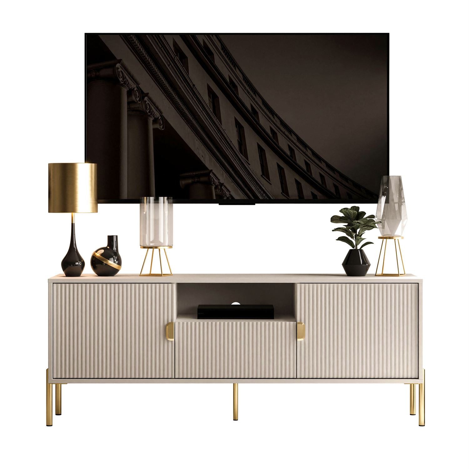 Das TV-Board verfügt über eine Schublade und zwei geschlossene Fächer, mit denen Sie den Raum effizient organisieren und verschiedene Gegenstände stilvoll verstauen können.