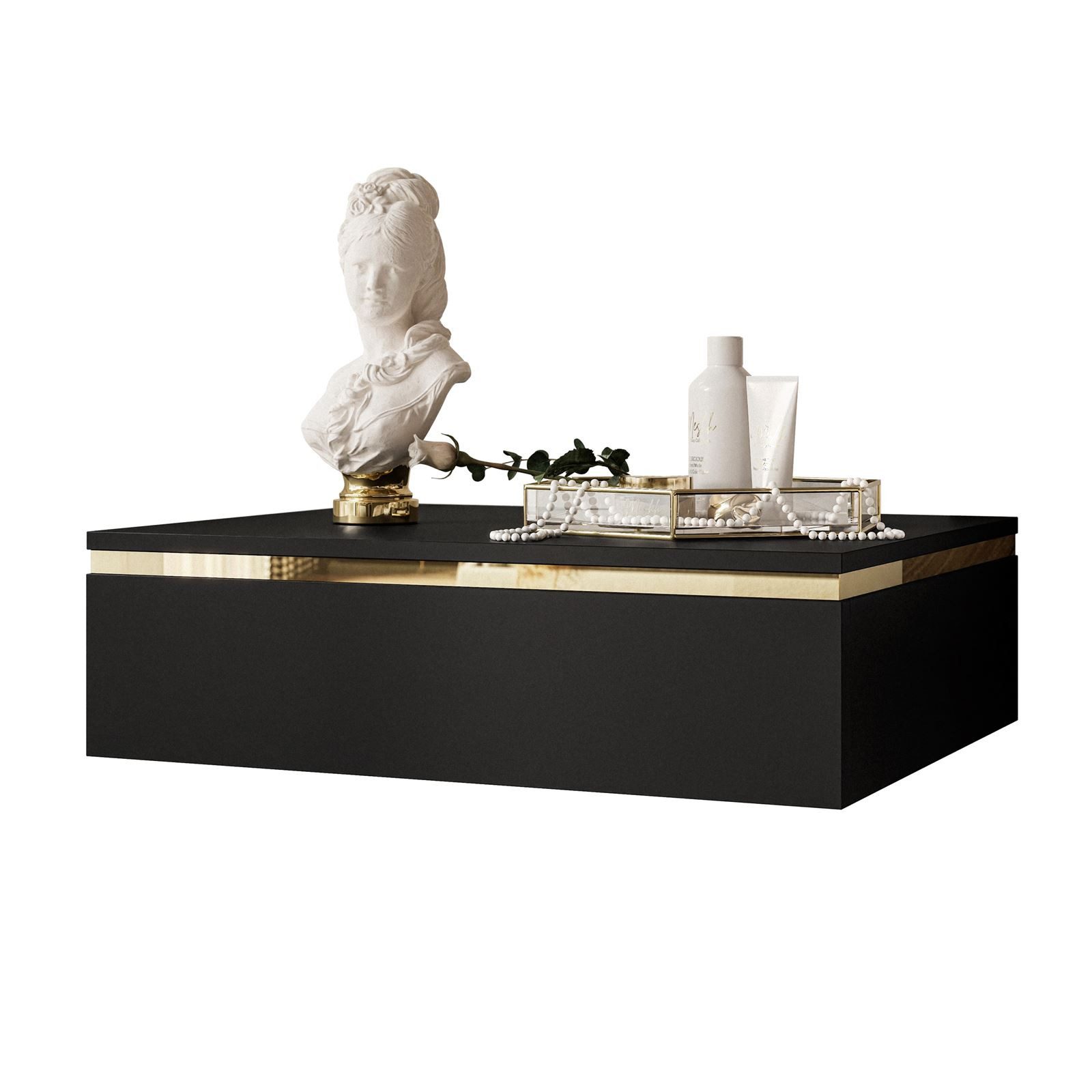 Der Nachttisch in mattschwarzer Ausführung ist der Inbegriff von modernem Stil und Funktionalität. Sein unverwechselbarer Charakter wird durch den goldenen Streifen um das Gehäuse herum unterstrichen, der ins Auge sticht und die Gesamtaussagekraft und den exklusiven Charakter unterstreicht.