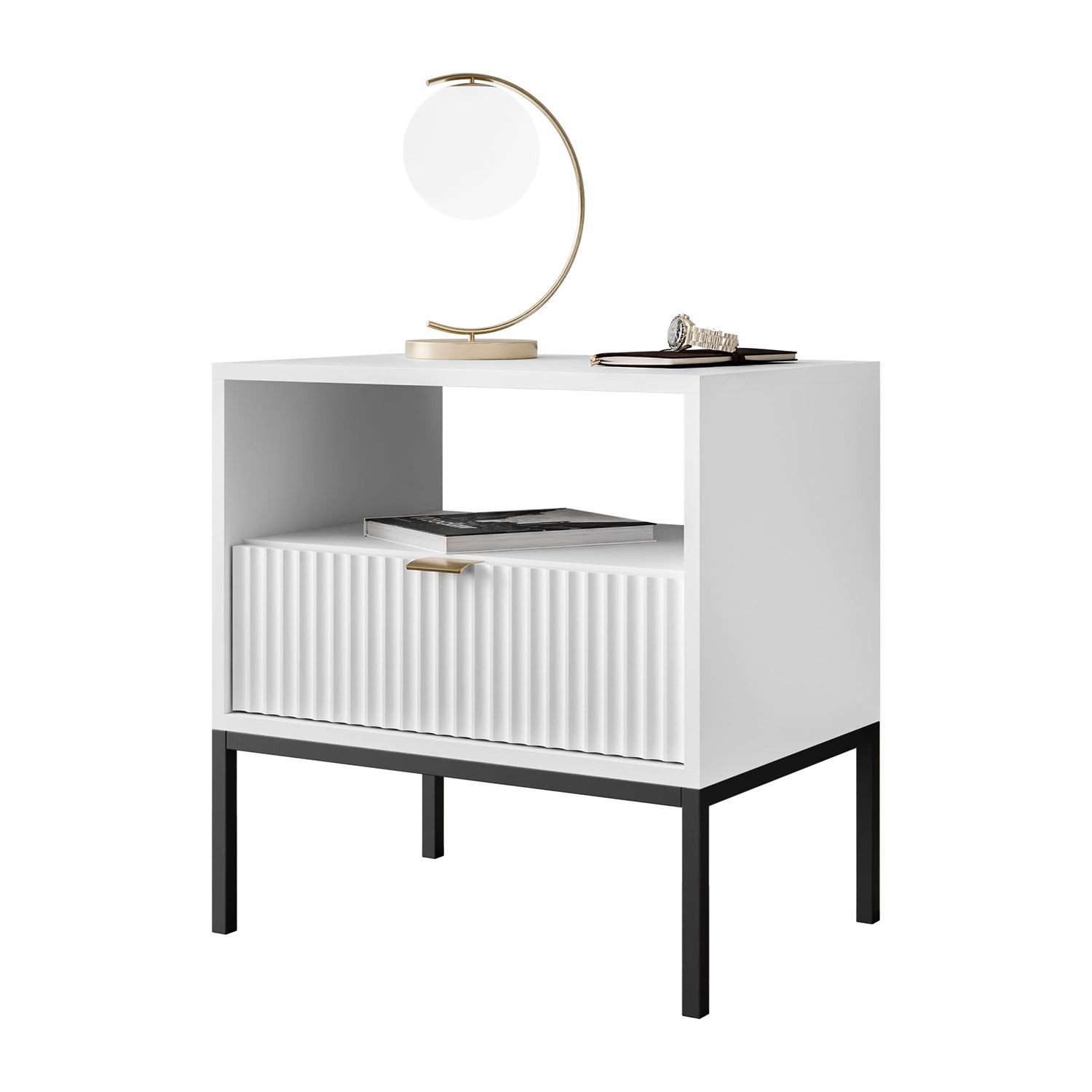 Elegante, geriffelte Fronten sind ein Schlüsselelement des Designs, das eine subtile Textur schafft, die das Auge anzieht und dem Möbelstück Tiefe und Eleganz verleiht. Diese Details betonen den modernen Charakter des Nachttisches, verleihen ihm einen zeitlosen Look und machen ihn zu einem stilvollen Schmuckstück des Raumes, das eine raffinierte Atmosphäre schafft.