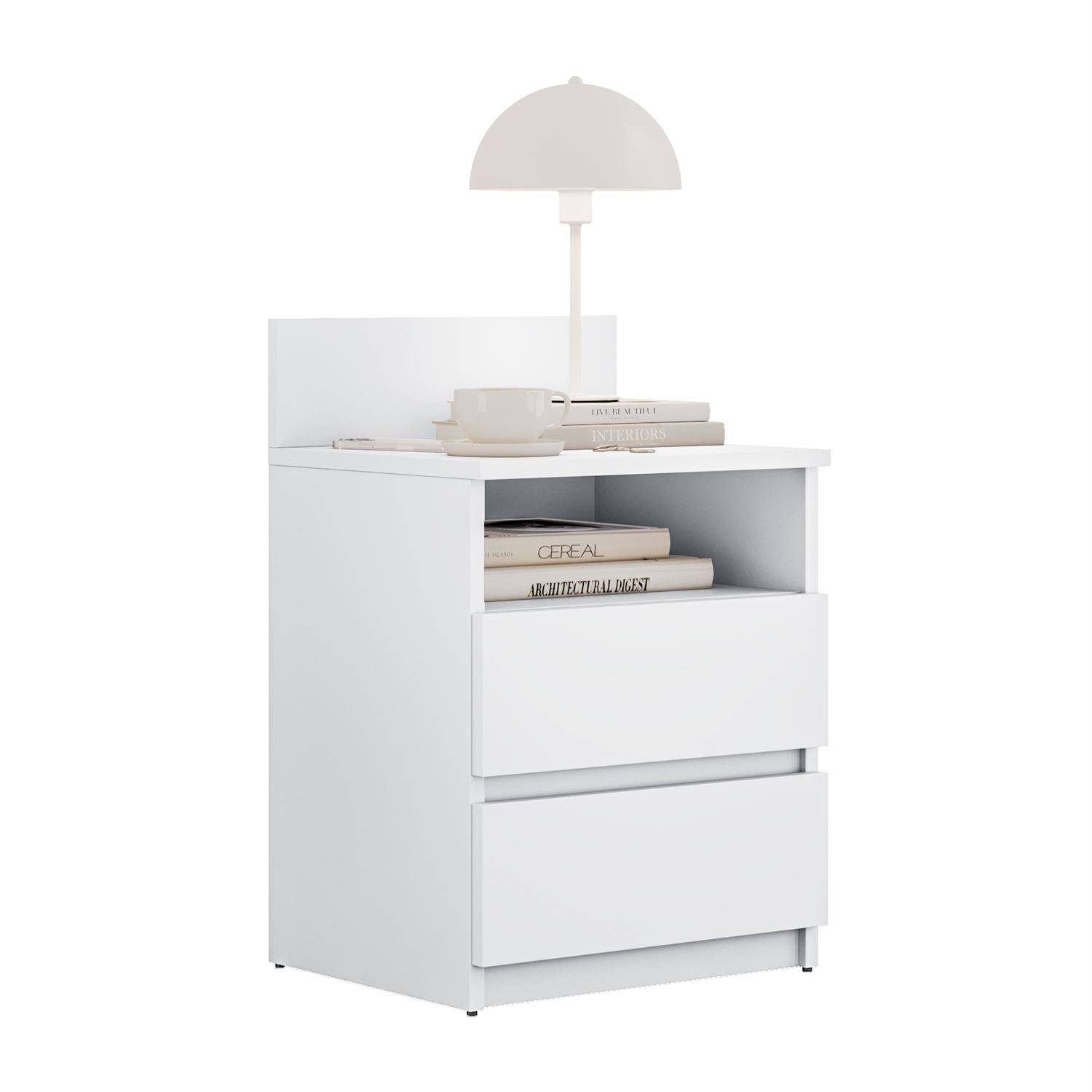 Zwei geräumige Schubladen bieten bequemen Platz für alle Gegenstände, die Sie immer griffbereit haben möchten – Buch, Handy oder Brille. Dank des durchdachten Designs erleichtert das Möbelstück die Organisation und bringt Ordnung in den Alltag, ohne dabei viel Platz einzunehmen.