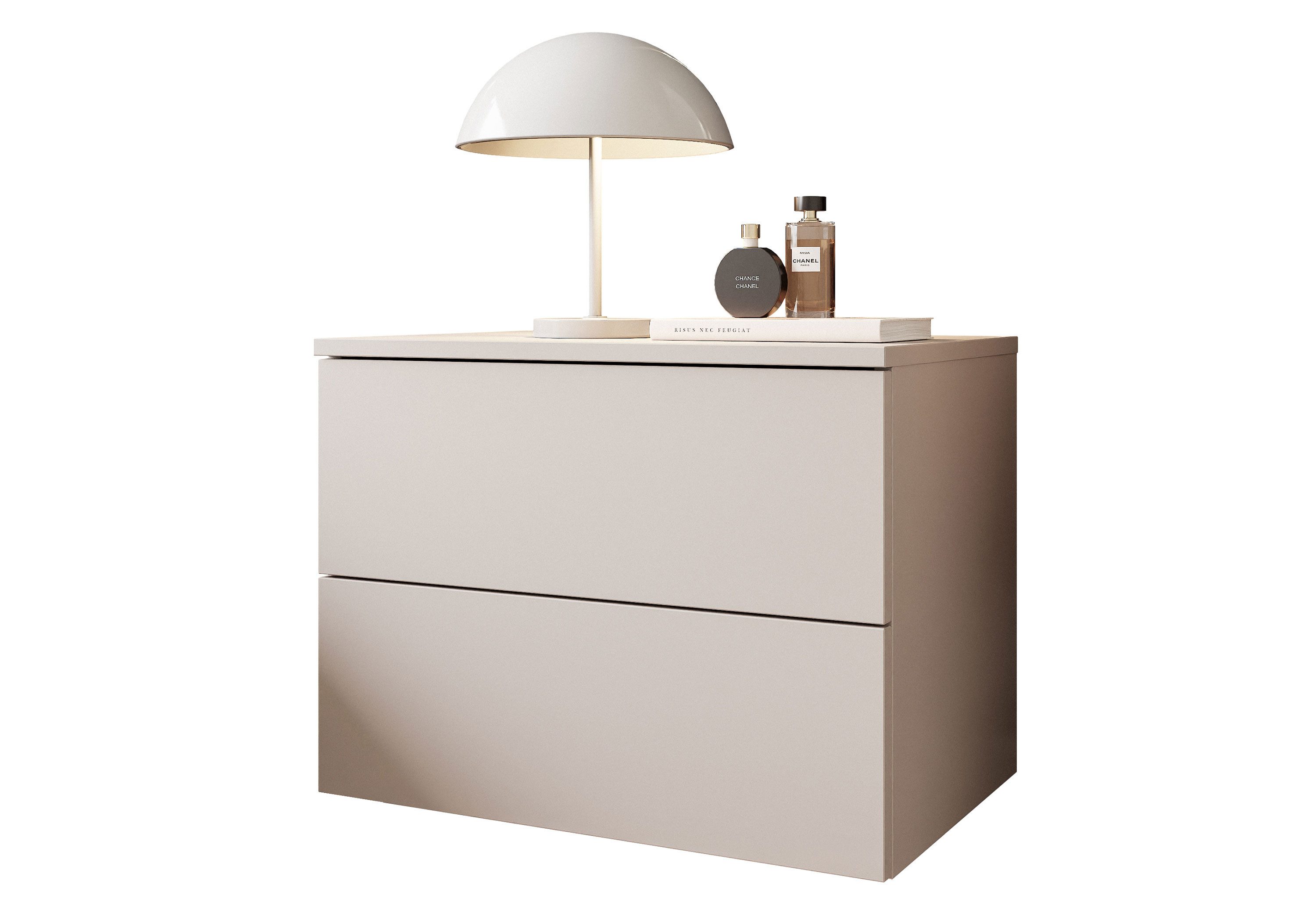 Seine schlichte, geometrische Form in der Farbe Kaschmir, veredelt mit einer robusten ABS-Kante, harmoniert perfekt mit verschiedenen Wohnstilen – von modern bis klassisch. Dank der hängenden Konstruktion gewinnt das Möbelstück optische Leichtigkeit, erleichtert die Reinigung und verleiht der Einrichtung einen zeitgemäßen Charakter.