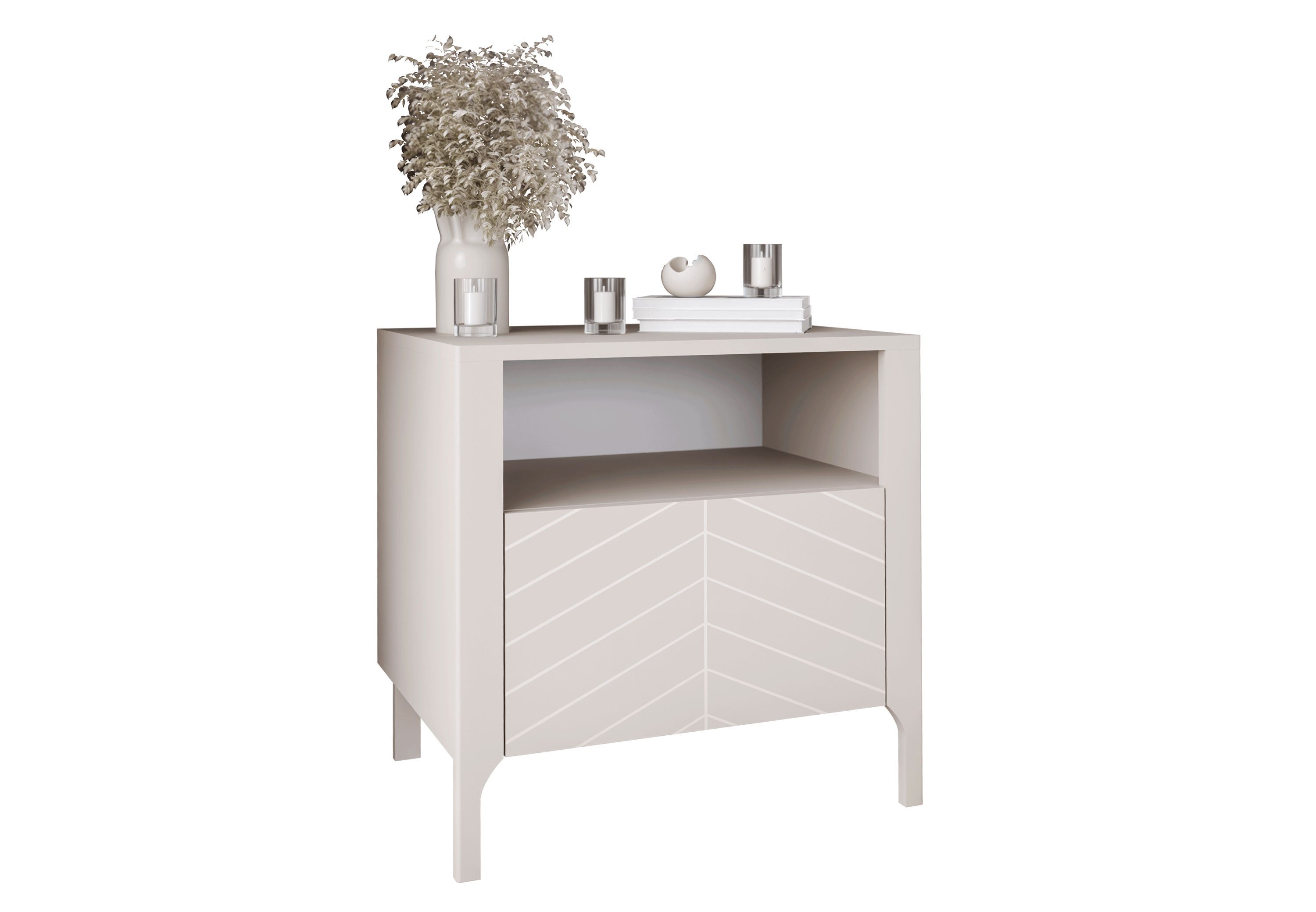 Die minimalistische Form des Tisches mit einer Front, die mit einem geometrischen Fischgrätenmuster verziert ist, verleiht ihm einen einzigartigen Charakter, der sich von klassischen Möbeln abhebt. Dank seiner kompakten Abmessungen passt er perfekt neben jedes Bett, unabhängig von der Raumgröße.