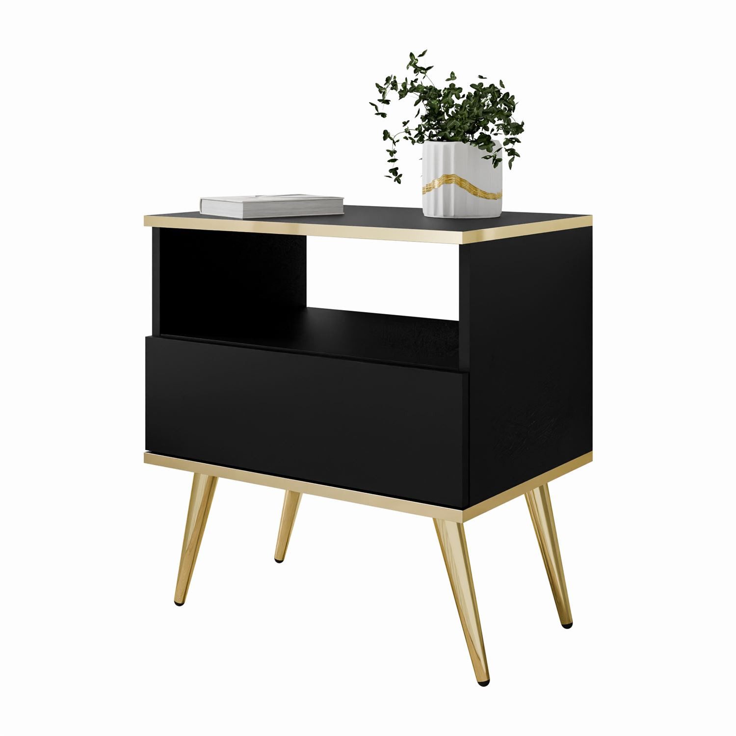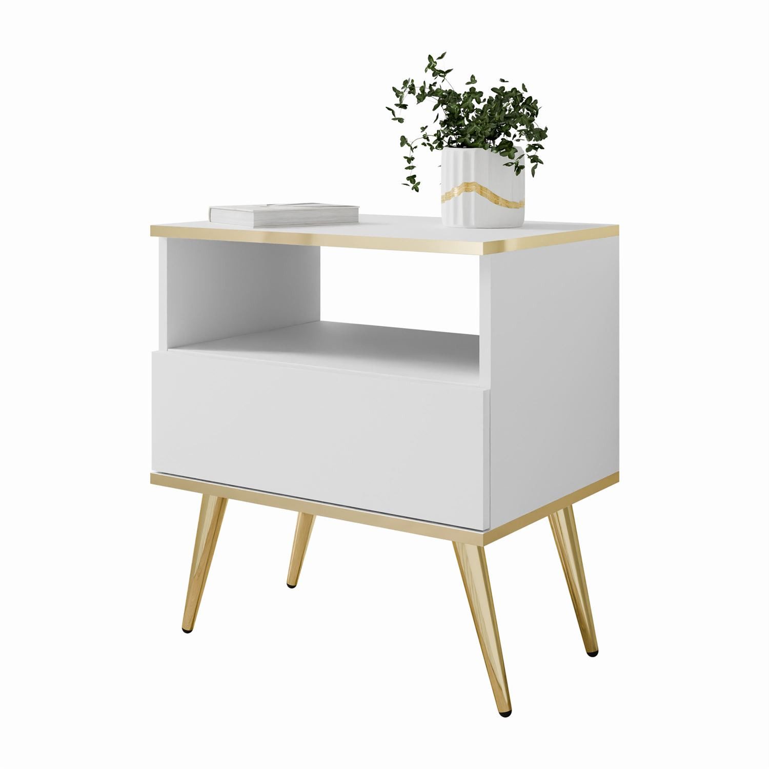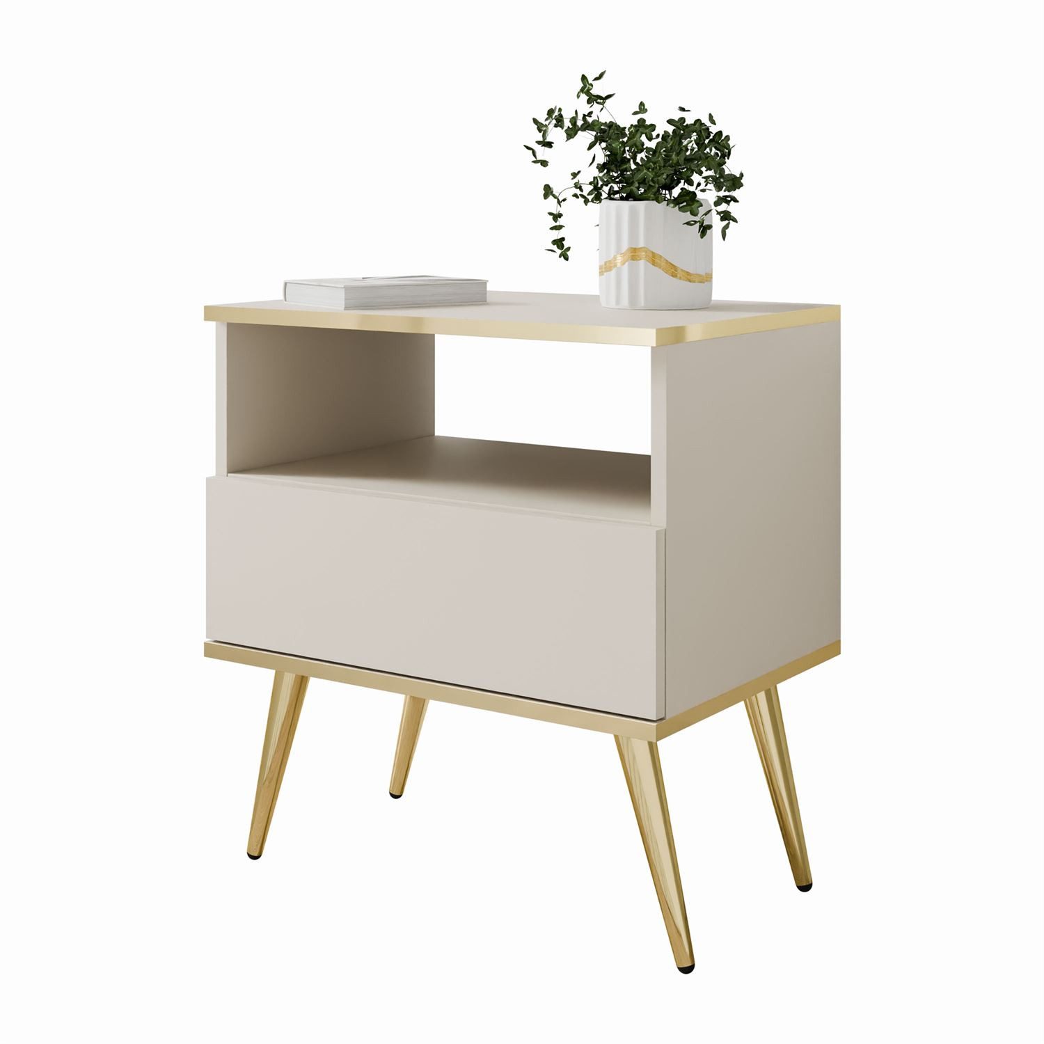 Die minimalistische Form des Nachttisches wird durch dezente goldene Details ergänzt, die ihm eine edle Ausstrahlung verleihen. Die schlanken, abgeschrägten Beine aus goldfarbenem Metall sorgen für eine leichte Optik und gleichzeitig für hohe Stabilität. Dekorative goldene Kanten auf der Tischplatte runden das elegante Gesamtbild perfekt ab.