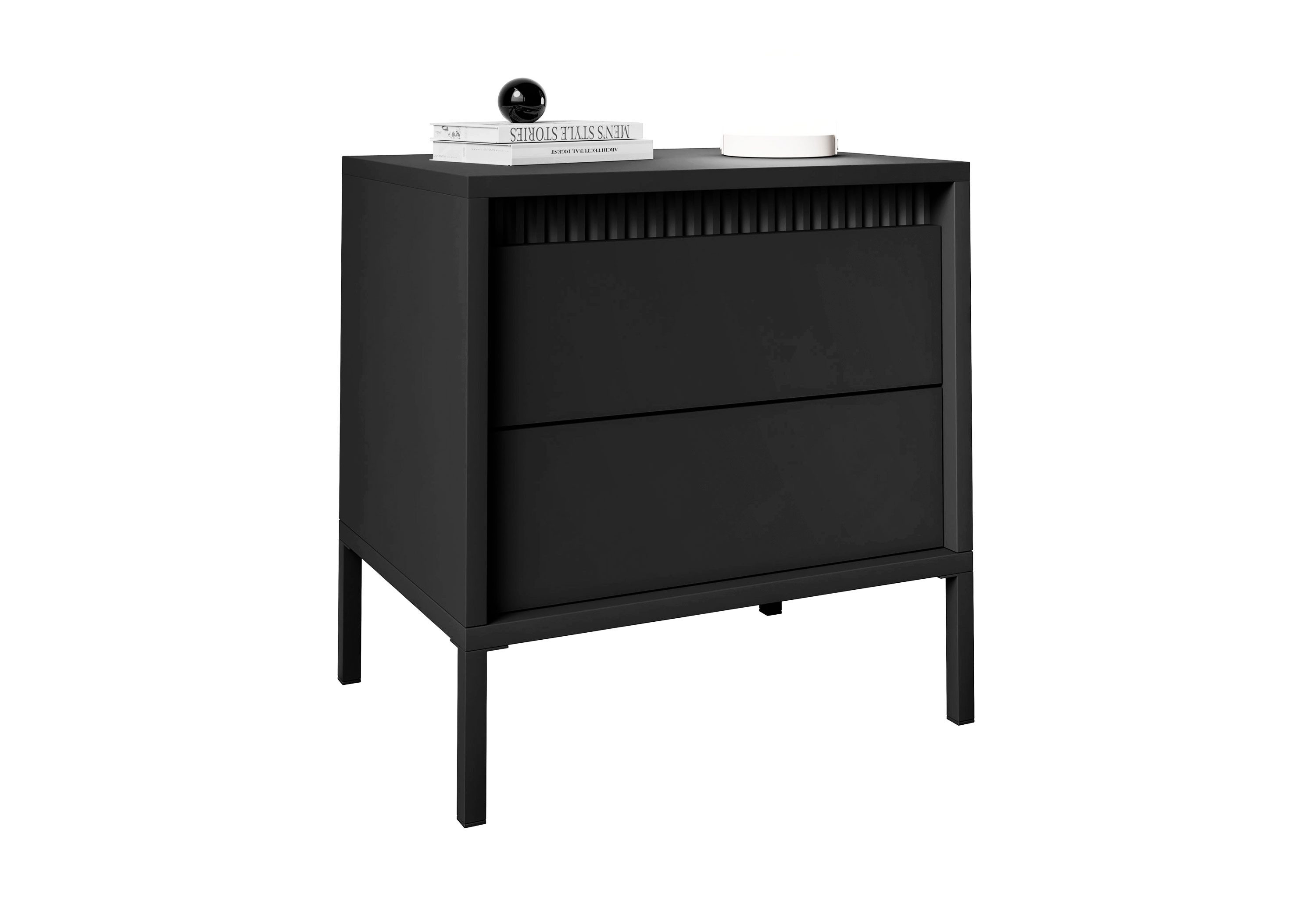 Das Ganze steht auf hohen, schlanken Beinen in tiefem Schwarz, die dem Nachttisch Leichtigkeit und eine moderne Ausstrahlung verleihen. Diese Konstruktion unterstreicht nicht nur den Stil des Möbelstücks, sondern erleichtert auch die Reinigung darunter – für mehr Alltagskomfort.
