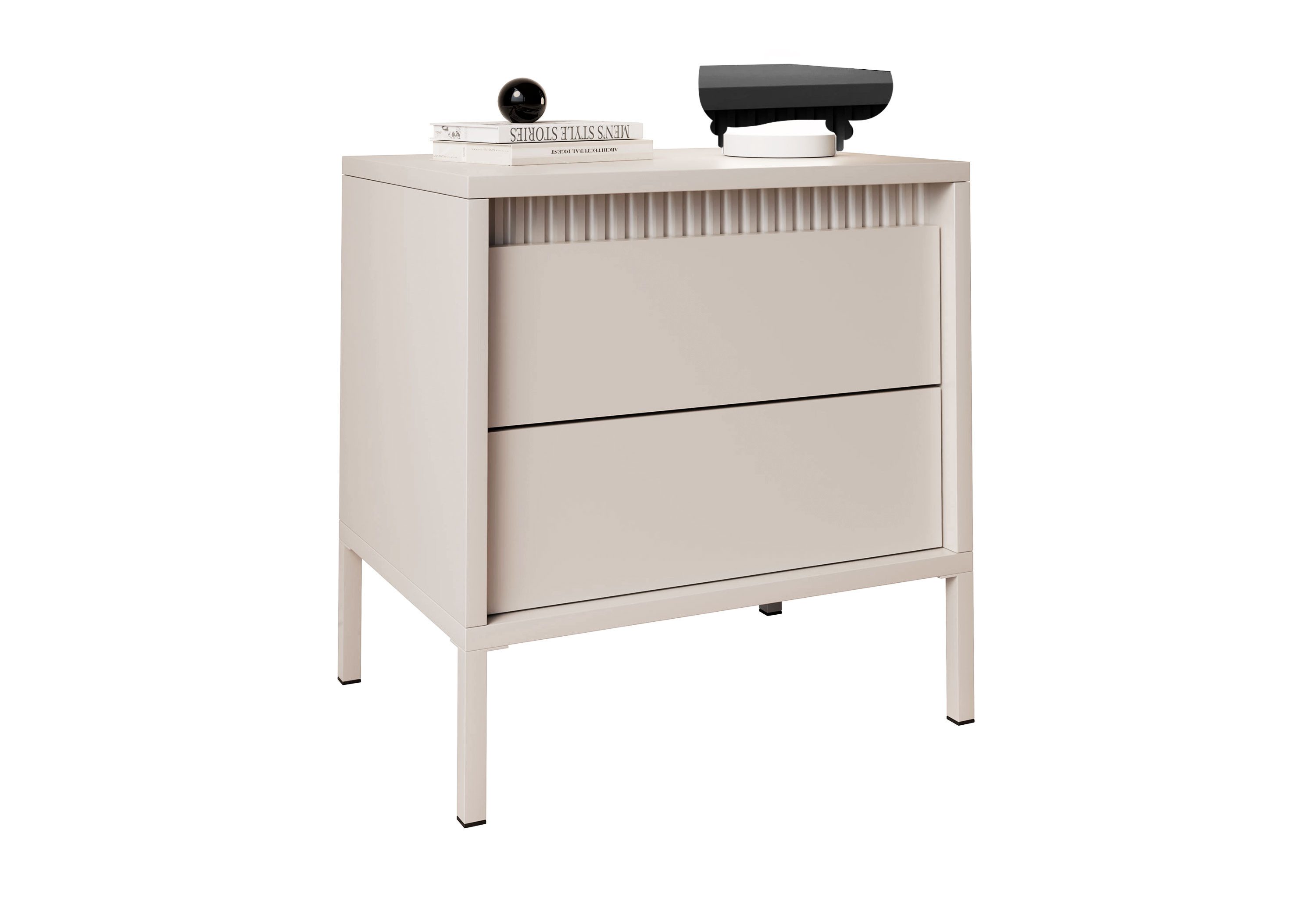 Das Möbelstück ist mit zwei geräumigen Schubladen ausgestattet, die praktischen Stauraum für Bücher, Accessoires oder Alltagsgegenstände bieten. So hilft der Nachttisch dabei, Ordnung zu halten und den Bereich rund ums Bett übersichtlich zu gestalten.