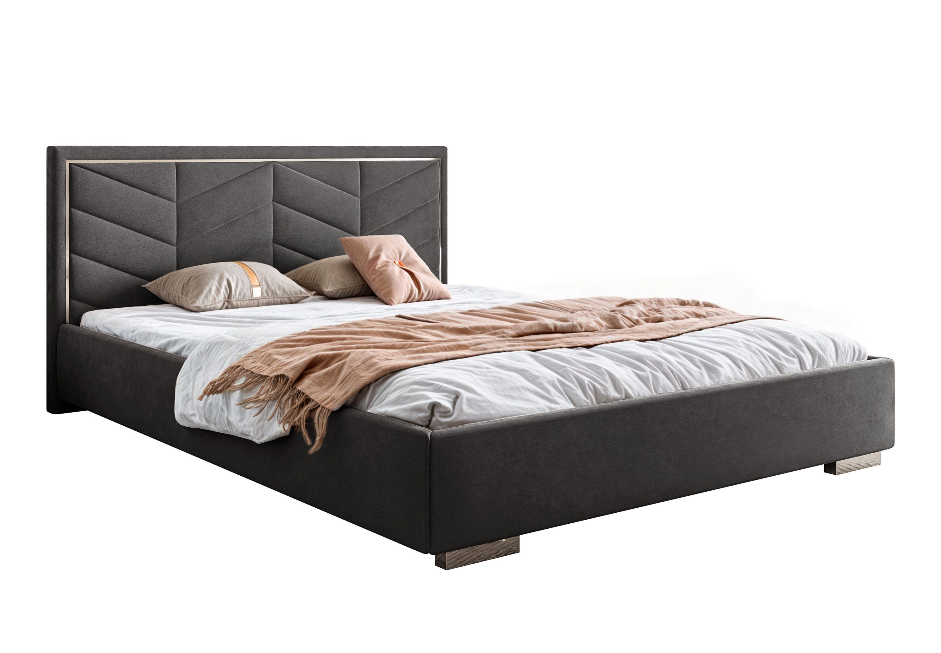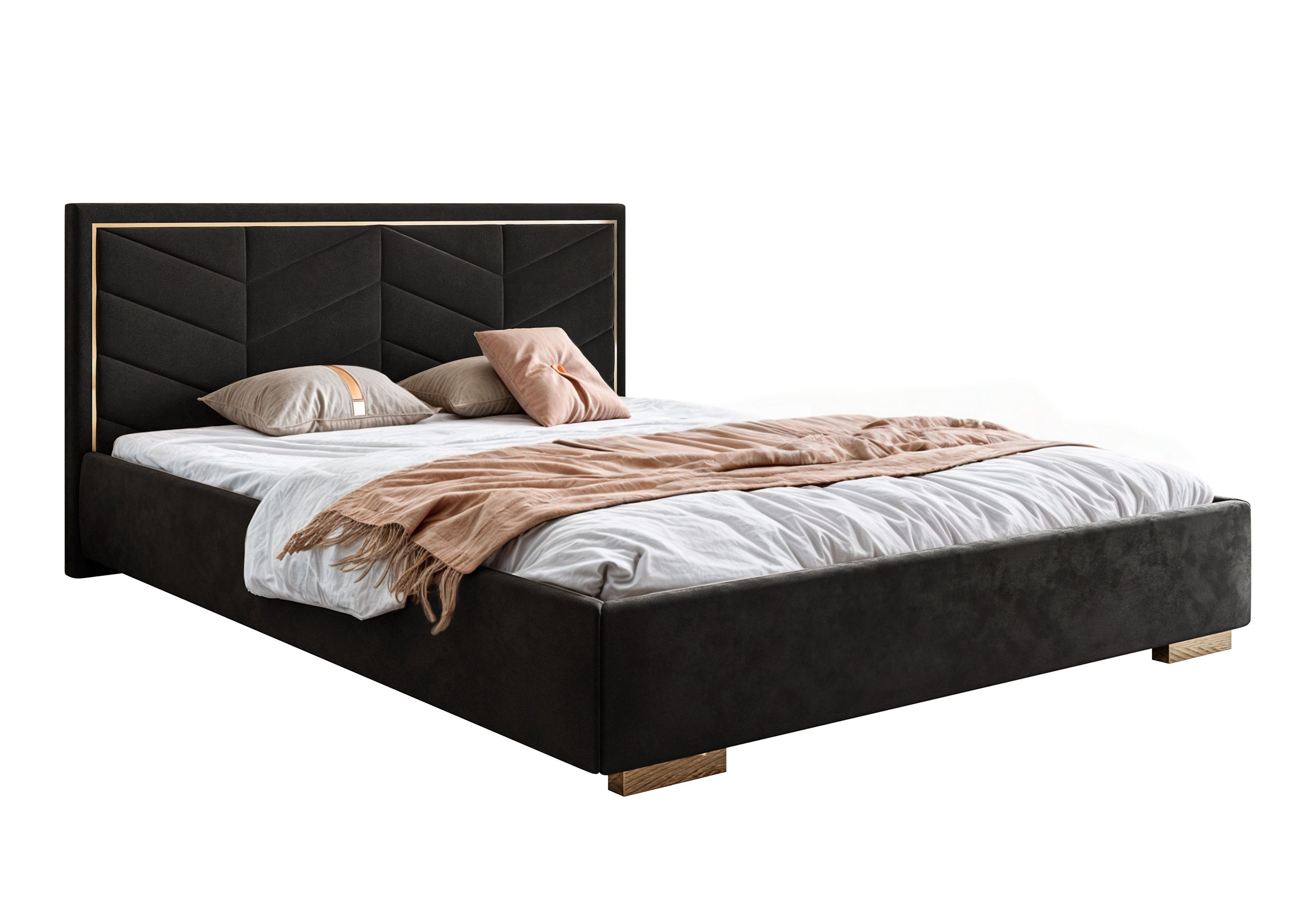 Beim AURORA Bett verleihen dezente Abschlusselemente Ihrem Schlafzimmer eine luxuriöse Ausstrahlung und bereichern sein Erscheinungsbild zusätzlich. Der goldene Streifen am Kopfteil ist ein außergewöhnliches Detail, das dem Raum Eleganz verleiht und seinen einzigartigen Charakter zart unterstreicht. Ein weiteres Unterscheidungsmerkmal unseres Bettes ist die elegante, mit geometrischen Nähten verzierte Kopfstütze, die in zwei Größen zur Auswahl steht.