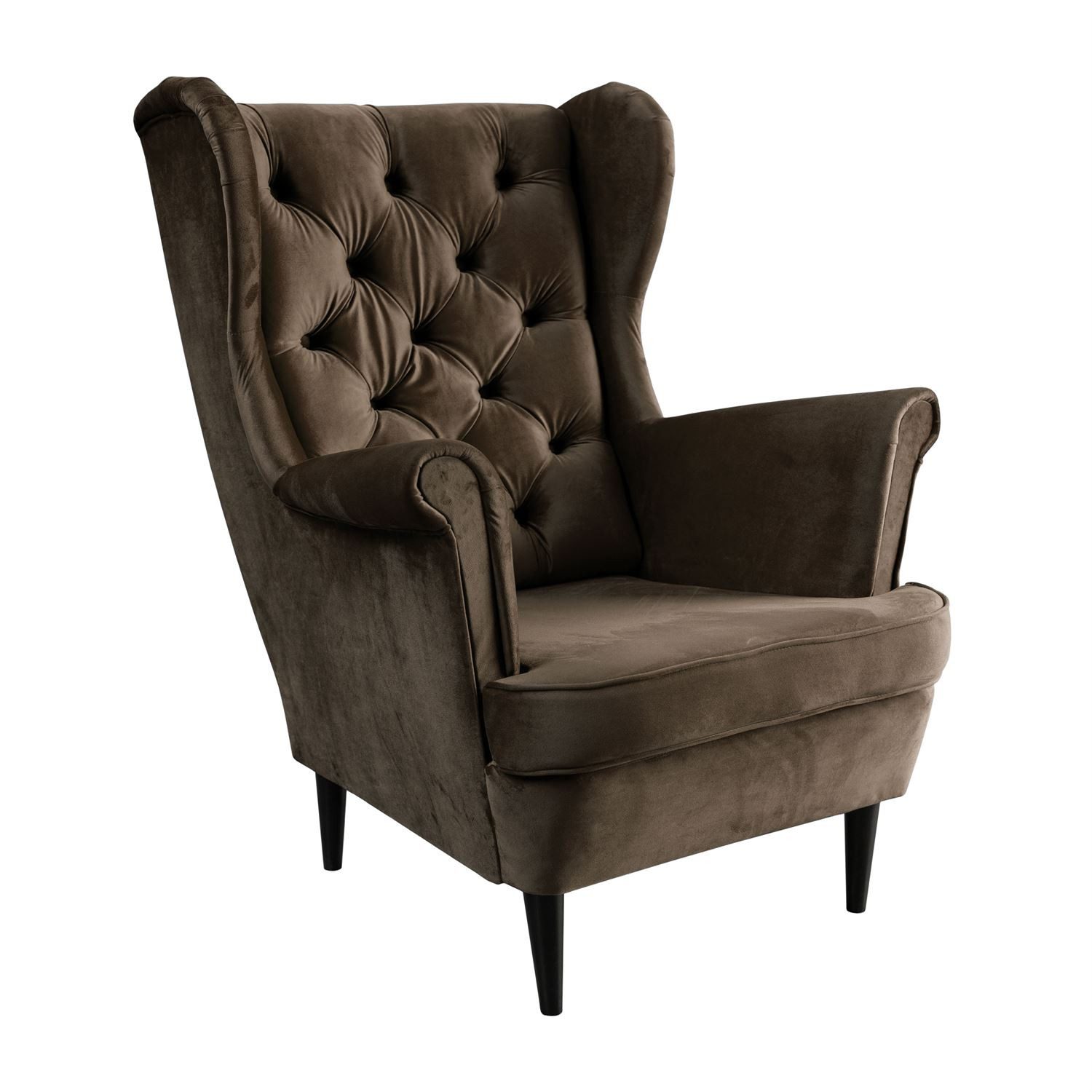 Das Modell steht auf schlichten, schwarzen Holzbeinen, die ihm ein modernes und vielseitiges Erscheinungsbild verleihen. Dadurch lässt sich der Sessel mühelos in verschiedene Wohnstile integrieren – von hellen skandinavischen Räumen bis hin zu industriellen Einrichtungen.