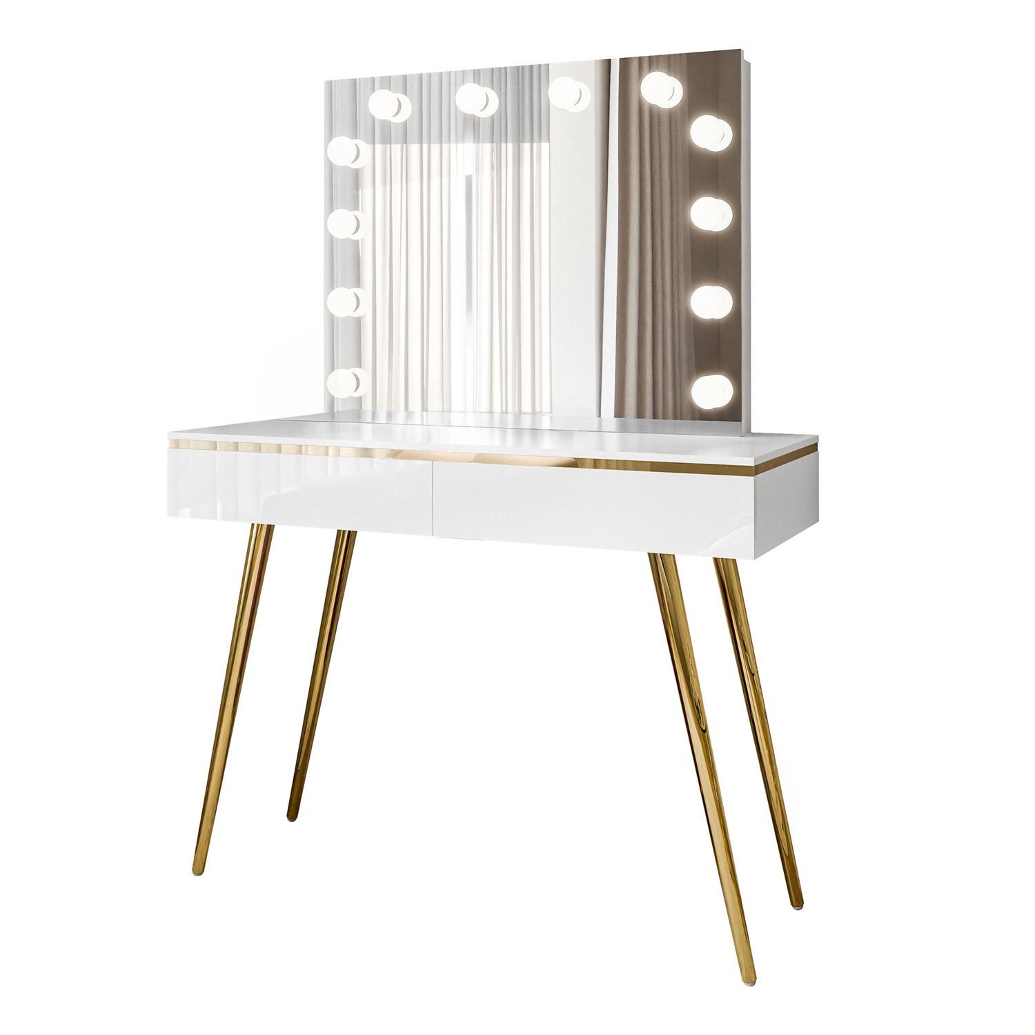 Hervorzuheben ist, dass der Schminktisch Aurora mit einem großen Spiegel ausgestattet ist, der von einem Kranz aus zwölf eleganten LED-Glühbirnen umgeben ist. Ihre symmetrische Anordnung garantiert eine perfekte Beleuchtung, die Ihnen ein Make-up auf höchstem Niveau ermöglicht.