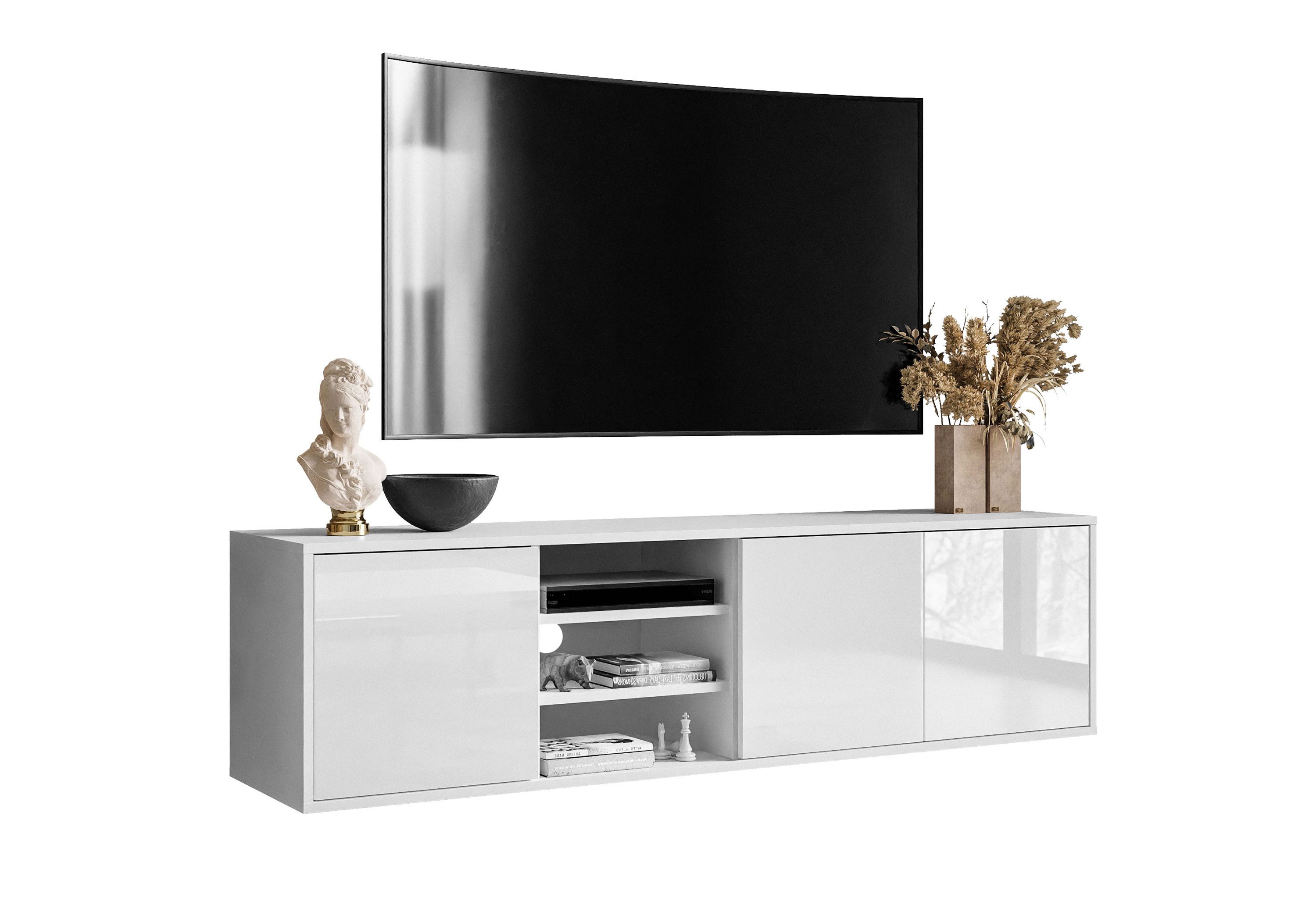 Sowohl rechts als auch links am Board befinden sich Türen, und im mittleren Bereich können Sie entscheiden, ob das TV-Board mit Fronten geschlossen oder mit offenen Regalfächern gestaltet wird. Die eleganten, grifflosen Fronten betonen den modernen und luxuriösen Stil des Möbels.