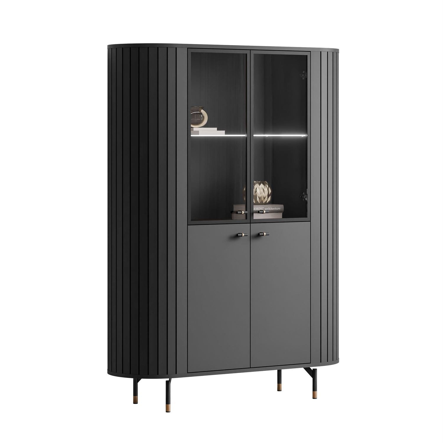 Charakteristische vertikale Fräsungen an den Seitenfronten sowie abgerundete Kanten verleihen dem Möbelstück Leichtigkeit und subtile Eleganz. Die Details ziehen alle Blicke auf sich und machen die Vitrine zu einem idealen Bestandteil von minimalistischen, glamourösen und zeitgenössisch-eleganten Einrichtungsstilen.
