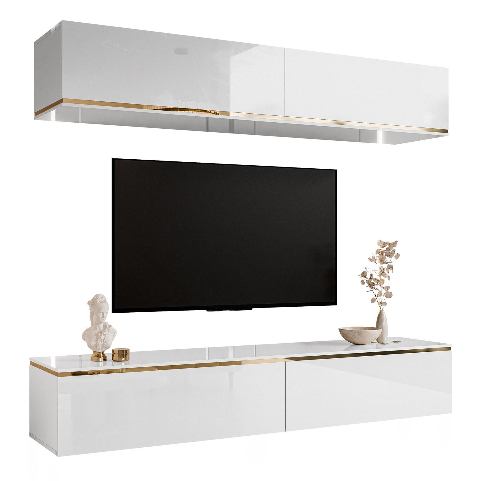 Sowohl die Oberplatte als auch die Fronten des Schranks wurden aus einer hochwertigen Acrylplatte gefertigt, die ihm einen außergewöhnlichen Glanz und Eleganz verleiht. Sie ist nicht nur langlebig, sondern auch leicht zu reinigen und wird ihre Schönheit über Jahre hinweg bewahren. Die goldenen Streifen um den Schrank herum verleihen ihm einen zarten Touch, der die Blicke auf sich zieht und seinen einzigartigen und exklusiven Charakter unterstreicht.