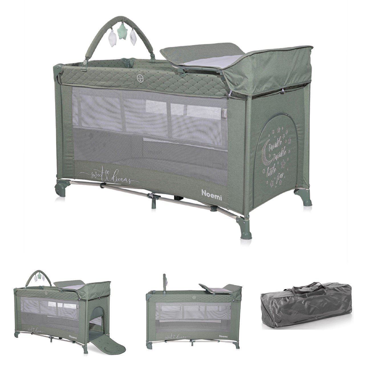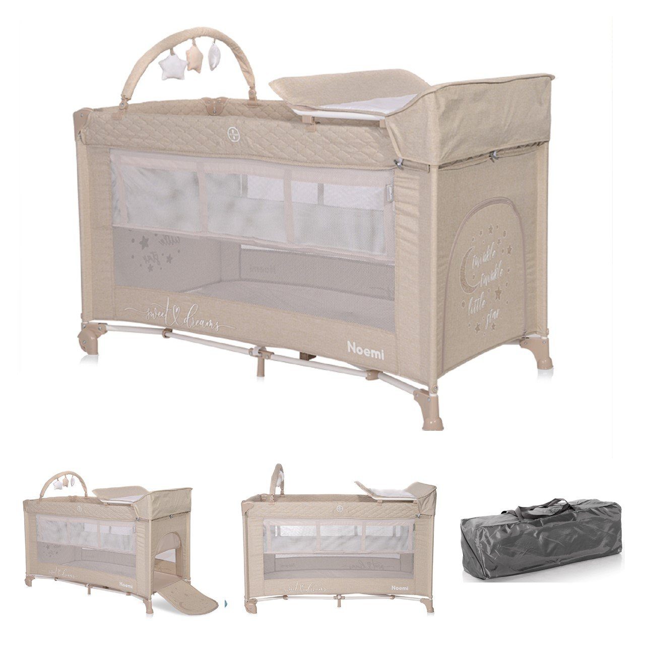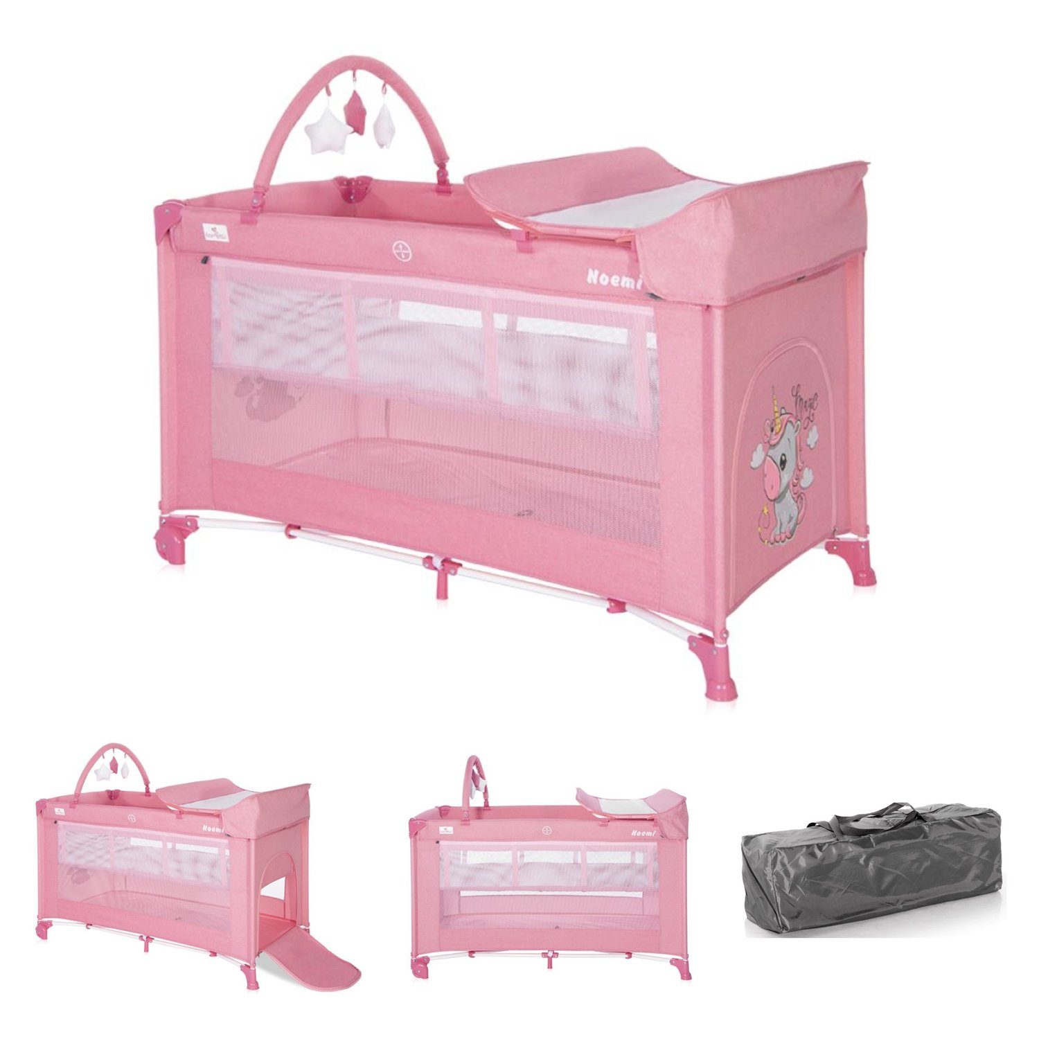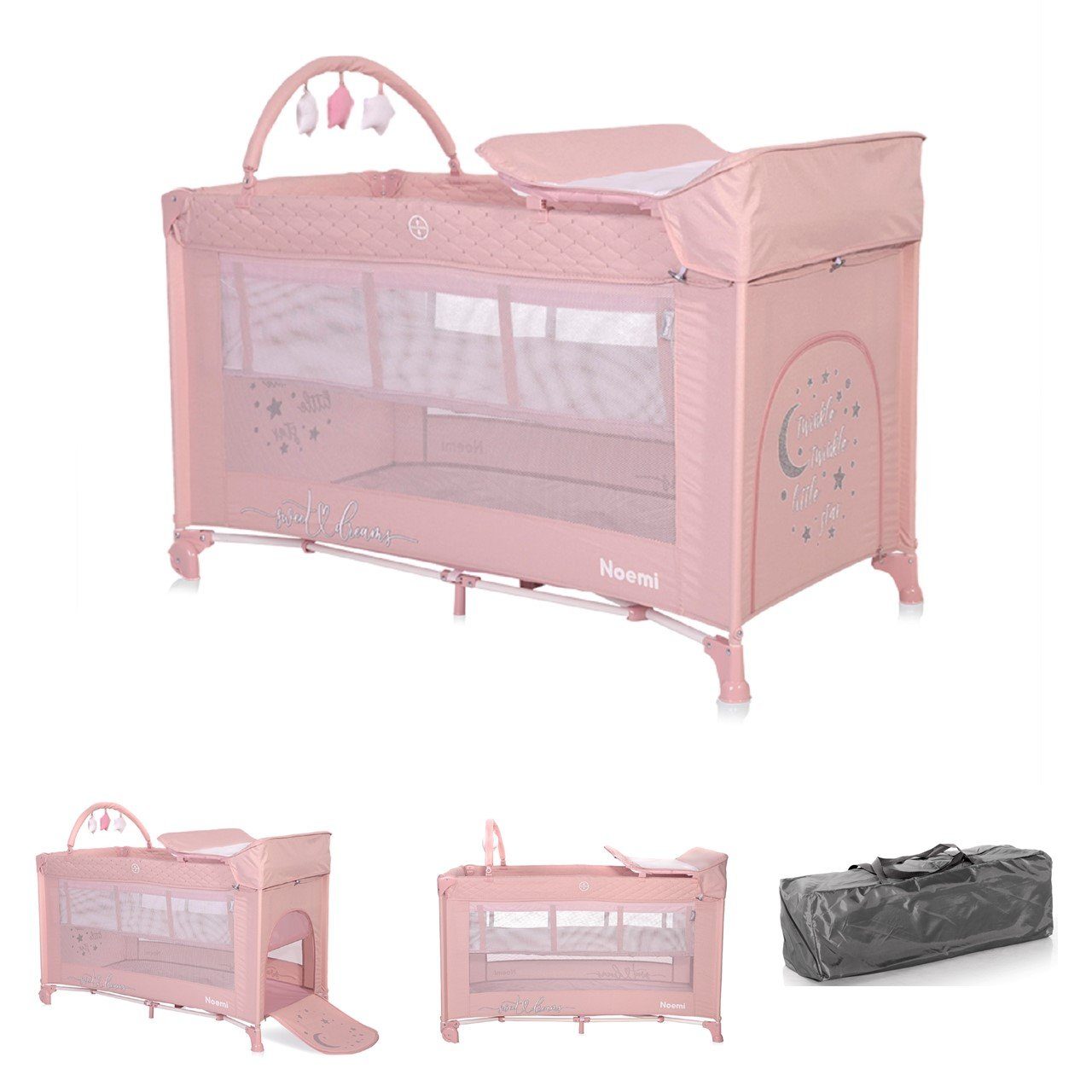 Besonderheiten Artikel Lorelli Reisebett Noemi 2 Ebenen, Wickelauflage, Spielbogen, Tragetasche, Räder: