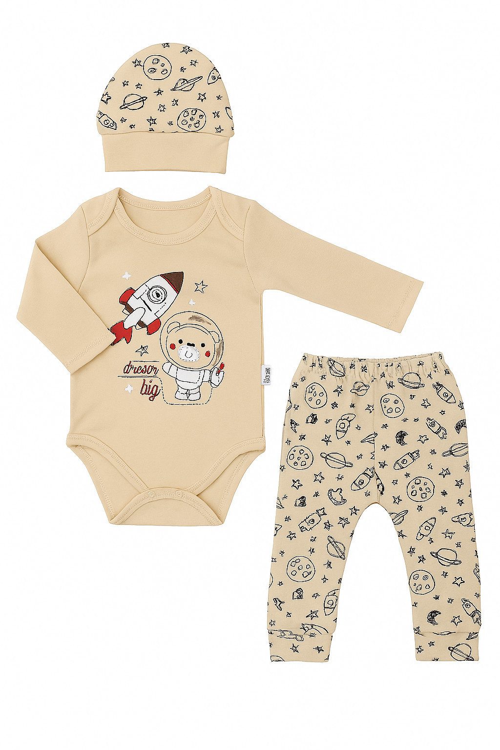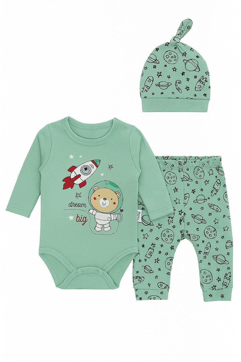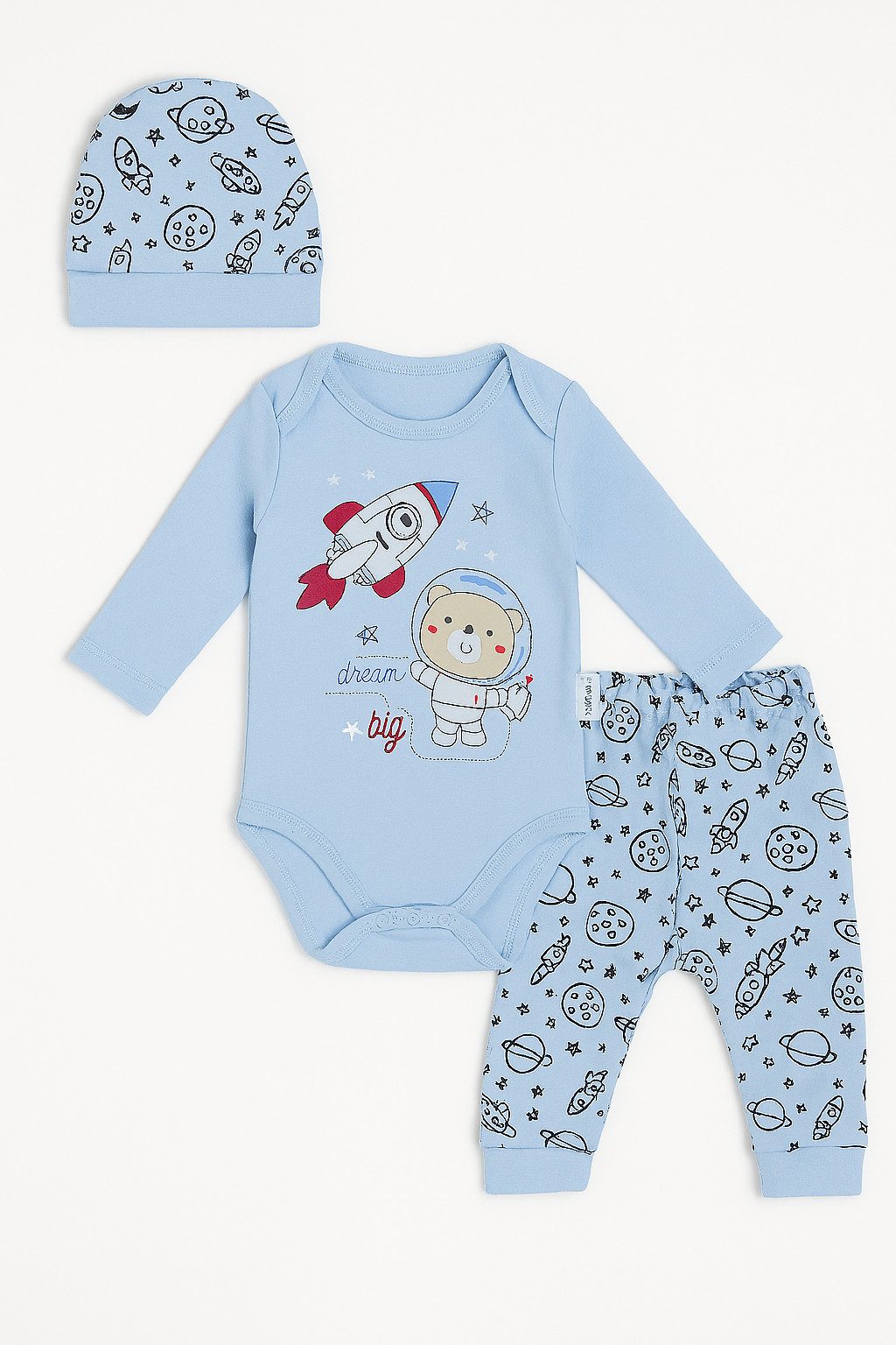 Das Set besteht aus einem weichen Langarm-Body mit niedlichem Astronauten-Aufdruck, einer gemütlichen Hose mit Allover-Weltraummuster und einer passenden Mütze mit Knoten. Dank 100 % hautfreundlicher Baumwolle ist das Outfit angenehm zu tragen und ideal für empfindliche Babyhaut.