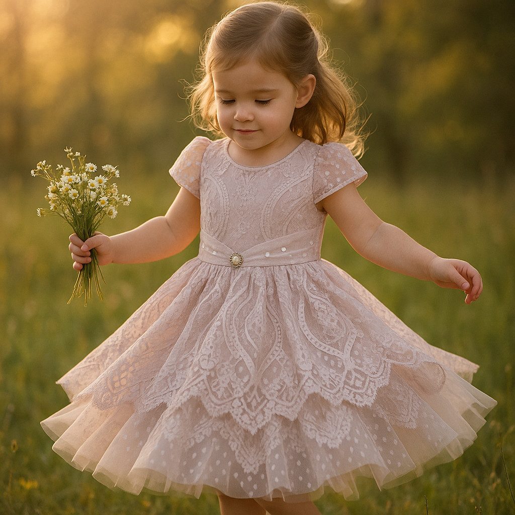 Dieses traumhafte Mädchenkleid von Nikilori Kids ist ein stilvolles Highlight für besondere Anlässe. In zartem Rosé gehalten, begeistert es mit feiner Spitze, liebevollen Details und einem voluminösen Tüllrock – perfekt für Taufen, Hochzeiten, Geburtstage oder Fotoshootings.