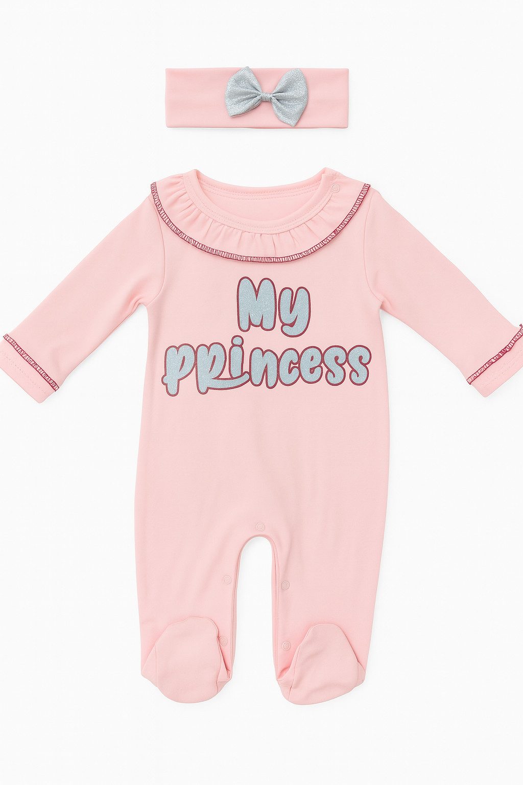 Dieser liebevoll gestaltete 2-teilige Mädchen-Strampler ist ein echtes Highlight für kleine Prinzessinnen! Das Set besteht aus einem langärmligen Einteiler in zartem Rosa mit verspieltem „My Princess“-Print und feinen Rüschen am Kragen – kombiniert mit einem farblich passenden Stirnband samt eleganter Schleife.