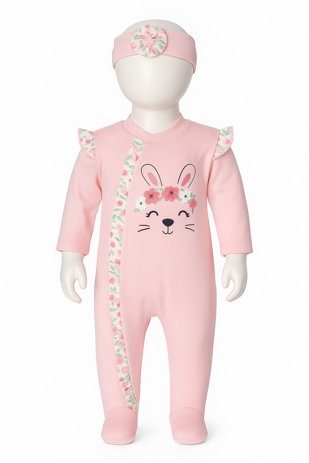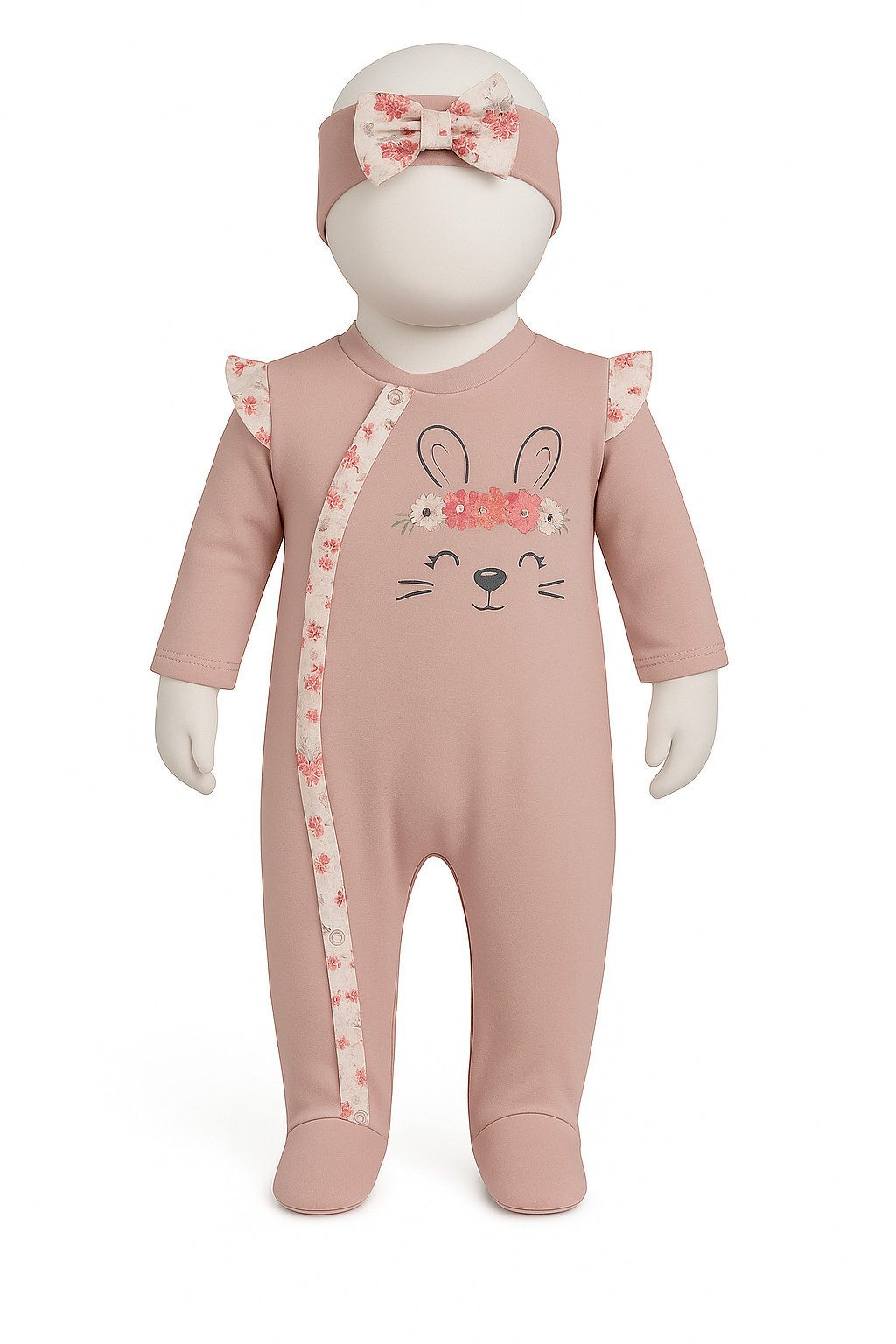 Dieses liebevoll gestaltete Strampler-Set besteht aus einem bequemen Einteiler mit Hasen-Motiv und zarten Blumen-Details sowie einem passenden Stirnband. Ideal für besondere Anlässe oder gemütliche Stunden zu Hause – ob in Rosa oder Beige, immer ein Blickfang.