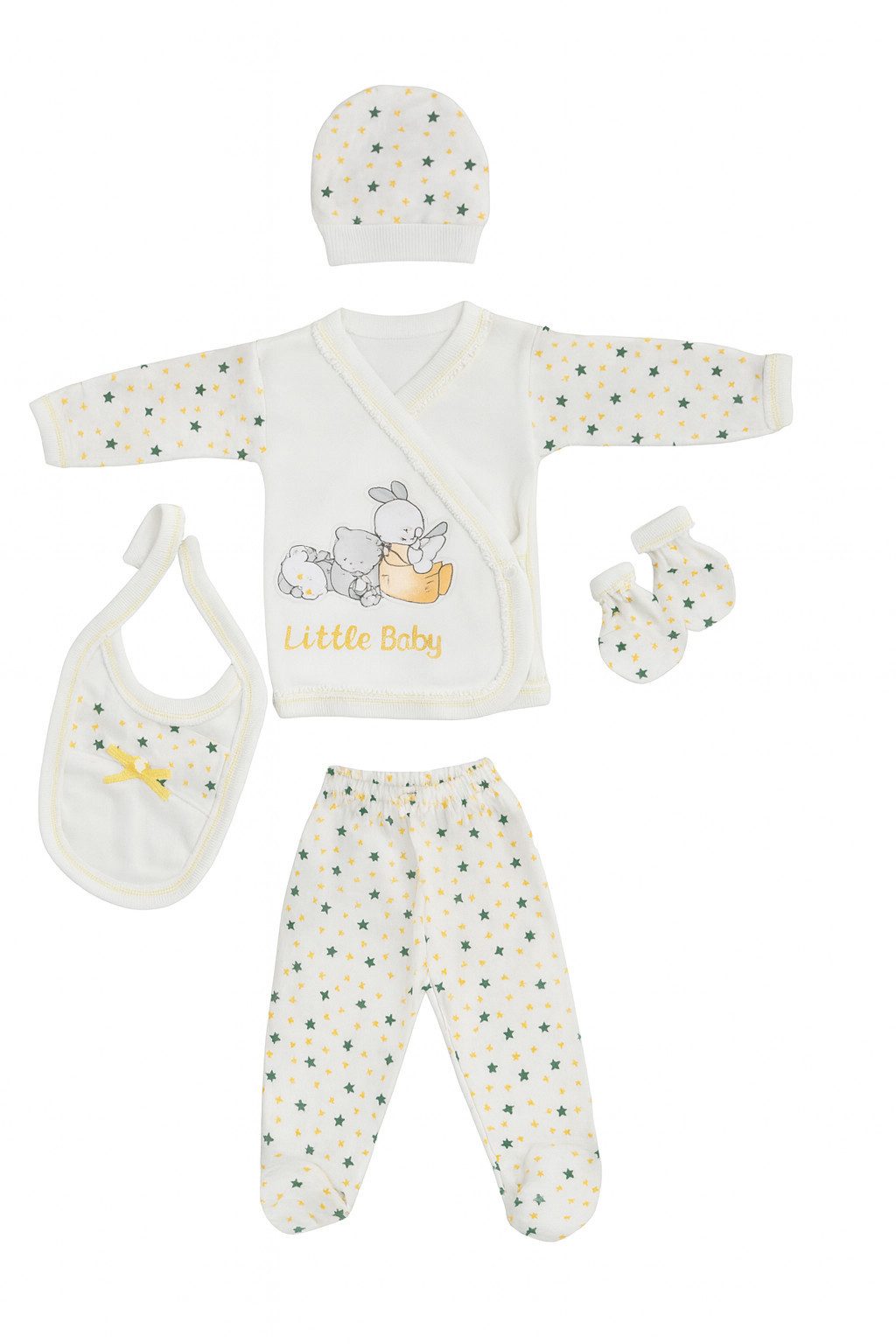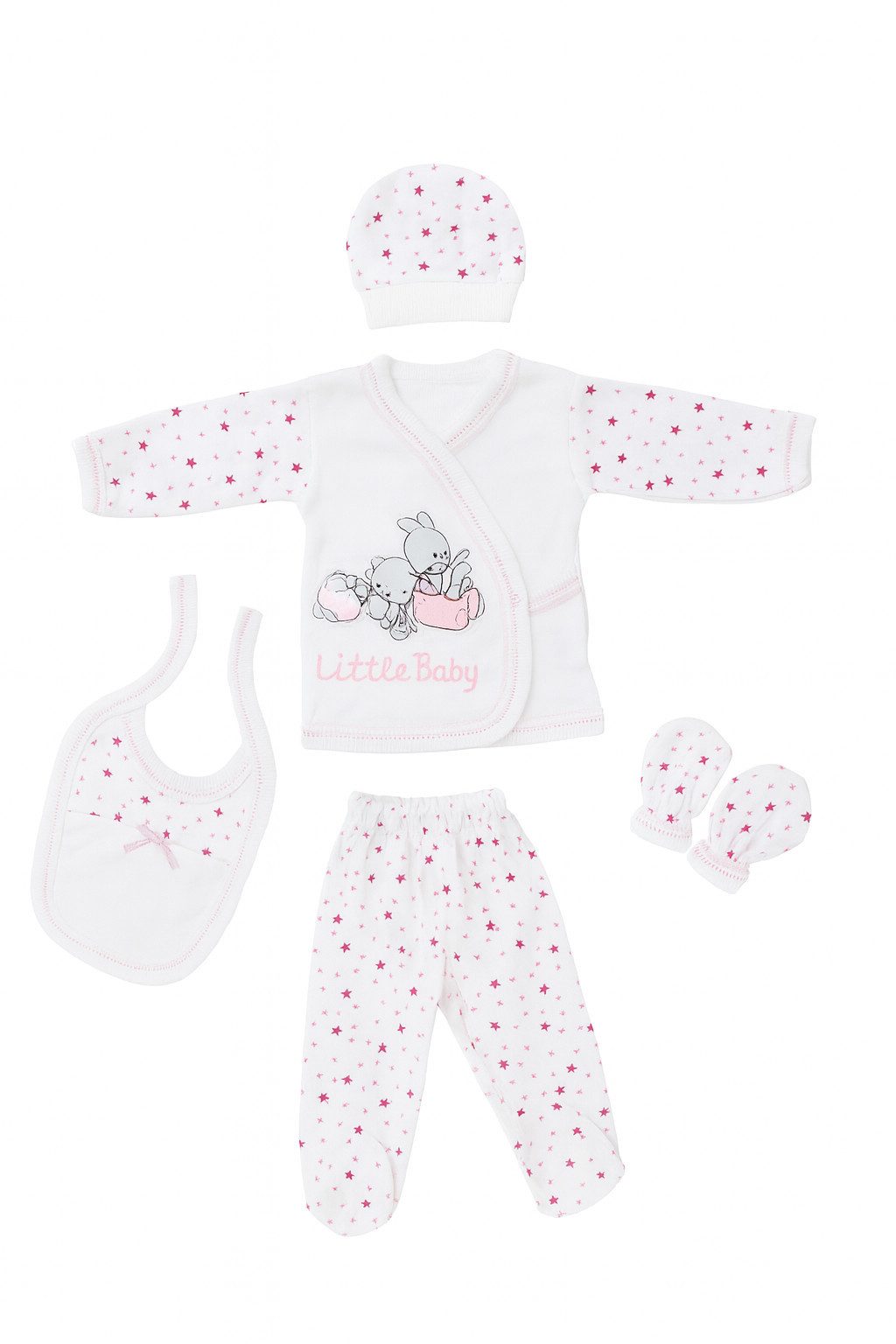 Dieses liebevoll gestaltete 5-teilige Baby-Outfit in Размер 56 ist ideal für Neugeborene. Das Langarm-Wickelshirt mit süßem Hasenprint wird kombiniert mit passender Hose, Mütze, Lätzchen und Fäustlingen – alles in harmonisch abgestimmtem Design mit Sternchenmuster.