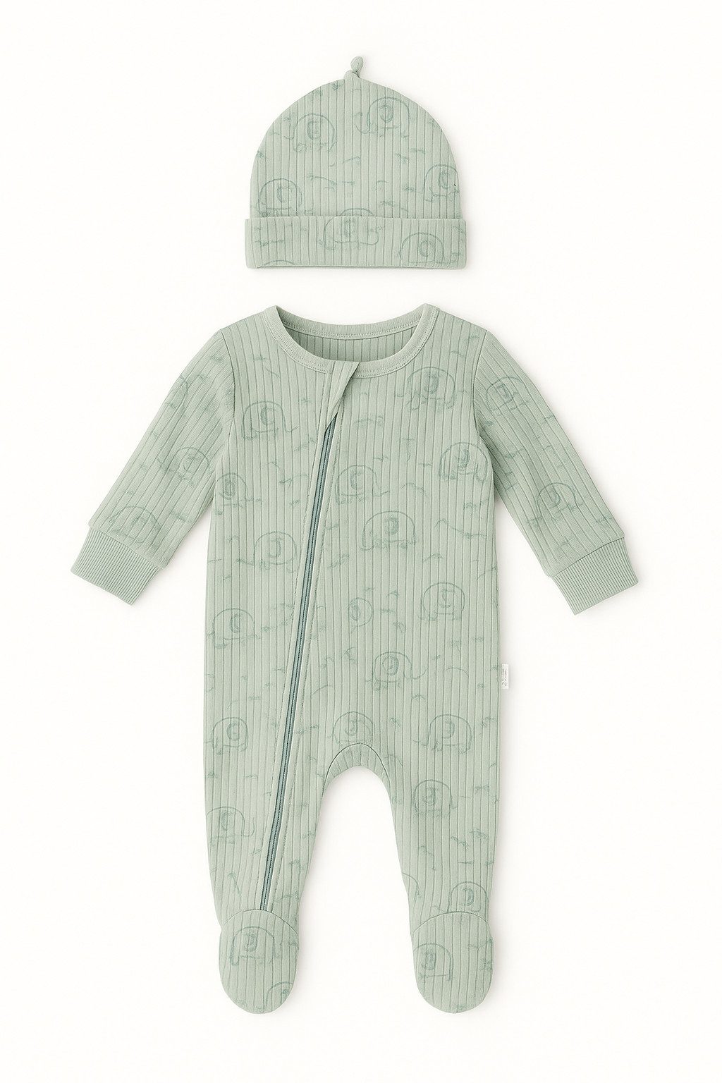 Dieses zweiteilige Baby-Set in zartem Grün kombiniert weichen Komfort mit einem dezenten, liebevoll gestalteten Elefantenprint. Der Strampler mit Fuß und passender Mütze ist aus 100 % Baumwolle gefertigt – perfekt für sensible Babyhaut.