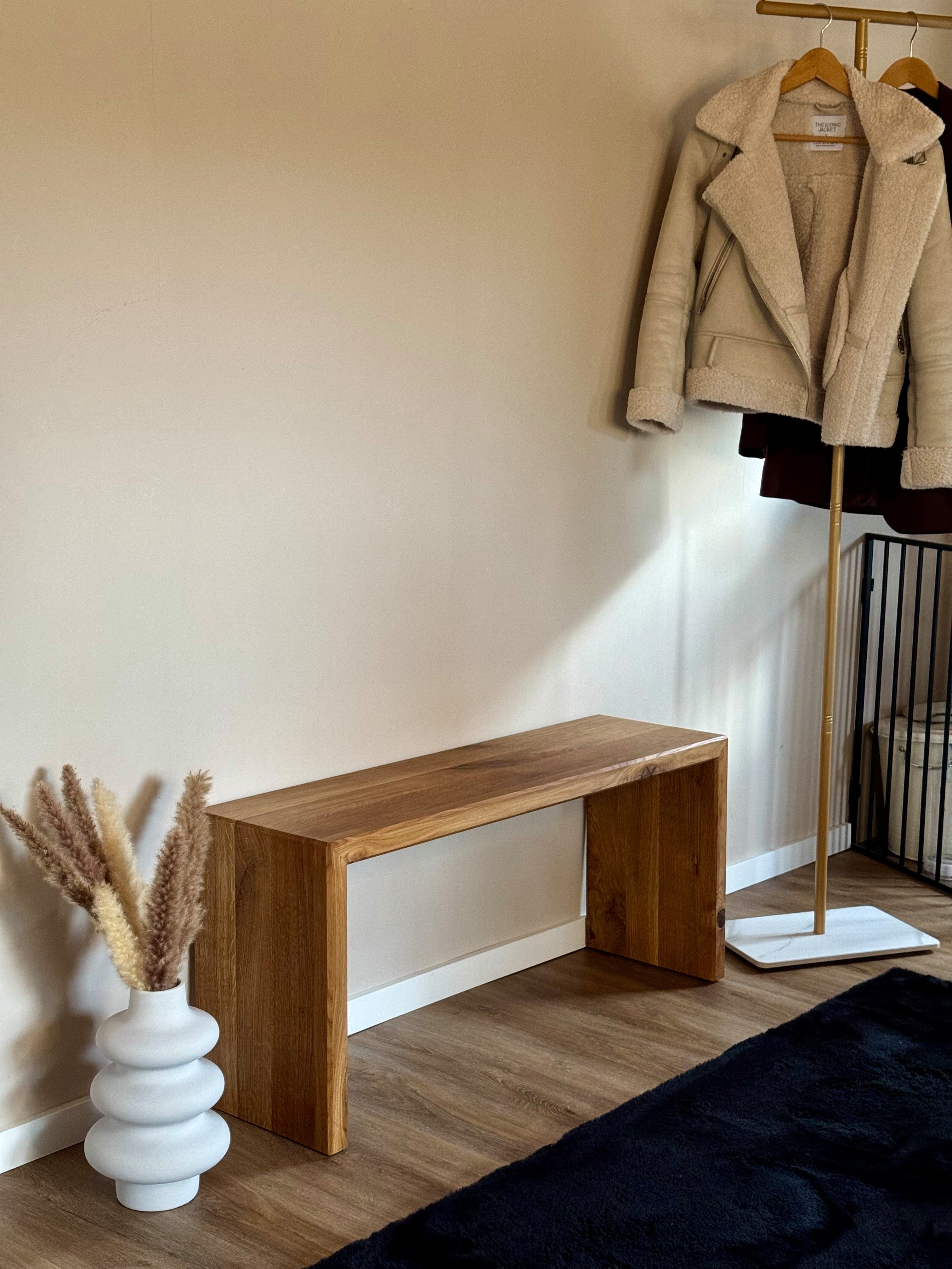 Massivholz-Eichensitzbank – Natürlich, Robust & Zeitlos Diese hochwertige Sitzbank aus massivem Eichenholz vereint minimalistisches Design mit natürlicher Eleganz. Die klare Linienführung und die warme Holzmaserung machen sie zu einem stilvollen Blickfang in jedem Raum – ob im Flur, Wohnzimmer oder Schlafzimmer. Dank der robusten Bauweise bietet sie eine langlebige und stabile Sitzgelegenheit. Ob als Sitzbank, Ablage oder dekoratives Möbelstück – diese Bank überzeugt durch ihre Vielseitigkeit und Qualität. Handgefertigt, langlebig und ein echtes Unikat für dein Zuhause! Sparen Sie Zeit und Nerven: Dieser Artikel wird komplett vormontiert geliefert – sofort einsatzbereit, ganz ohne Aufwand! Zusätzlich ist die Bank mit praktischen Einschraubfüßen ausgestattet, die einen Ausgleich bei unebenen Böden ermöglichen. So steht sie immer sicher und gerade – ganz egal, wo Sie sie platzieren. Hinweis: Dekorationsartikel auf den Fotos sind nicht im Lieferumfang enthalten. Besuchen Sie uns auf: Instagram: losbudos.wooddesign Facebook: LosBudos Für weitere Fragen stehen wir Ihnen jederzeit zur Verfügung – wir freuen uns darauf, Ihnen weiterzuhelfen!