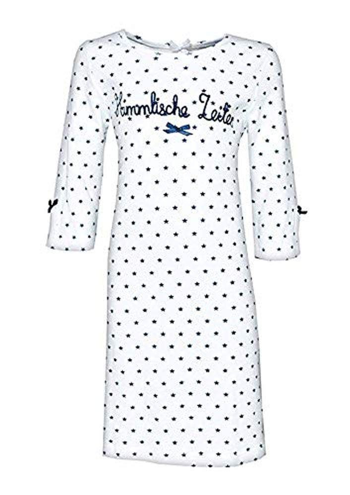 Das Mädchennachthemd aus dem Hause Louis & Louisa hat ein angenehmes Tragefühl, da es aus Baumwolle ist. Das Nachthemd ist weiß mit blauen Sternchen allover. Es hat den gestickten Schriftzug Himmlische Zeiten und eine kleine blaue Satinschleife.