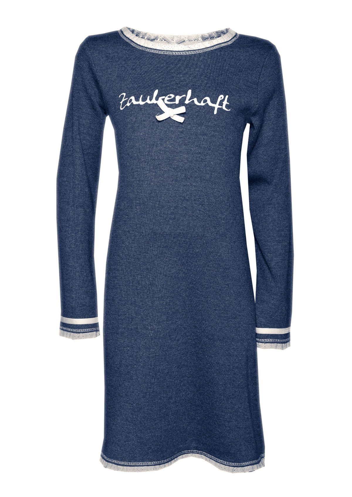 Feinripp Nachthemd für Mädchen in einem Jeansblau, bedruckt mit "Zauberhaft". Unter der Druckschrift befindet sich eine weiße kleine Samtschleife. An dem Rundhals und an den Armen ist eine weiße Spitzenborte. Das Kindernachthemd hat einen langen Arm. Wie alles aus dem Hause Louis&Louisa hat auch dieses Kindernachthemd einen angenehmen Tragekomfort. Ein ideales Geschenk oder auch Mitbringesel ist dieses Kindernachthemd.
