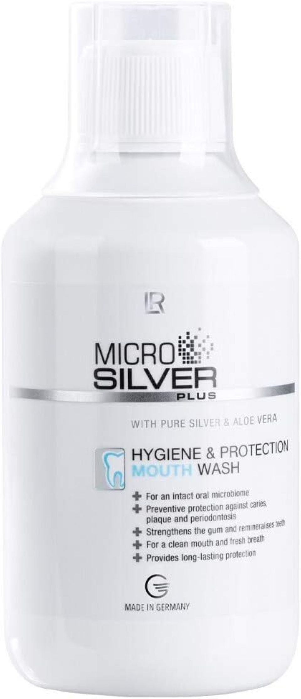 LR MICROSILVER PLUS Schützende Mundspülung Microsilver plus Aloe Vera – die antibakterielle Mundspülung von LR für ein frisch gepflegtes, geschütztes orales Mikrobiom in Balance. Bereits in der Mundhöhle beginnt unter anderem die Gesundheit für den Körper. Das hier vorherrschende orale Mikrobiom weist unzählige verschiedene Bakterien, Keime und Viren auf. Herrscht in der Mundhöhle ein Ungleichgewicht, kann dies zu unangenehmen Folgen führen: Unangenehmer Atem, schmerzempfindliche Zähne, entzündetes Zahnfleisch uvm. Bring deine Mundflora in Balance! Die besondere Kombination aus MicroSilver BG™ und Aloe Vera besitzt eine hochwirksame synergetische Wirkung und sorgt für effektive Hygiene und präventiven Schutz der Mundhöhle. Zusätzlich maximieren Natriumfluorid, Menthol und Pfefferminze die ausgezeichnete Wirkung und machen die Mundspülung zu einem unschlagbaren Beschützer, der für angenehme Frische im gesamten Mundraum sorgt. MicroSilver BG™ hat eine entzündungshemmende Wirkung und befreit die Mundhöhle nachweislich aktiv vor Bakterien und Viren. MicroSilver BG™ beugt der Bildung von Plaque, Karies und Parodontose vor, stellt das Gleichgewicht des oralen Mikrobioms (= Mundflora) wieder her und hält es zudem langfristig in Balance. Für einen gesunden Schutz vor Plaque, Karies und Parodontose Aloe Vera Barbadensis Gel verstärkt den antibakteriellen Effekt von MicroSilver BG™. Zudem stabilisiert und regeneriert es die natürliche Schutzbarriere des Zahnfleisches innerhalb der Mundhöhle und der Mundschleimhaut. Für ein gesundes und gepflegtes Zahnfleisch Natriumfluorid (200 ppm F-) stärkt den Zahnschmelz und wirkt remineralisierend auf die Zähne, sodass sie weniger empfindlich auf Säureangriffe reagieren und somit weniger anfällig für Karies sind. Für gesunde und starke Zähne Menthol und Pfefferminze verleihen der gesamten Mundhöhle sowie dem Rachen ein gereinigtes Gefühl und sorgen für eine angenehme Frische im gesamten Mundraum. Für einen langen und frischen Atem Die besondere, gelige Formulierung legt sich wie ein Schutzschild über die Oberflächen der gesamten Mundhöhle: über das Zahnfleisch, die Zunge, den Rachen und gelangt sogar bis in die Zahnzwischenräume. So wird die Neubildung von Bakterien und Virengehemmt. Für ein orales Mikrobiom in Balance und eine geschütze Mundhöhle In Zusammenarbeit mit renommierten Instituten hat LR die antibakterielle und antivirale Wirkung des LR MICROSILVER PLUS HYGIENE & PROTECTION MOUTH WASH ermittelt. Das Ergebnis zeigt: Die hochwirksame Mundspülung hinterlässt nicht nur ein sauberes Gefühl innerhalb der Mundhöhle und im Rachen sowie frischen Atem, sondern kann dank MicroSilver BG™ bis zu 99,99 % aller Keime wie Bakterien und Viren entfernen – ein außerordentlich gutes Ergebnis für ein kosmetisches Zahnpflegeprodukt. Wissenschaftliche Wirksamkeit: Dermatologisch getestet: SEHR GUT Über alle Anwender hinweg ist das Zahnfleischbluten bereits innerhalb der ersten 4 Wochen im Schnitt um 77 % zurückgegangen (Methode: Bestimmugn Gingiva Index durch Sondierung der Zahnfleischtashcen)* 75 % geben eine spürbare Verbesserung der Zahnzustände sowie positive Wirkung auf die Mundhöhle an* 70 % geben eine Stärkung des Zahnfleisches an* *Mundspülung getestet im Rahmen einer Anwenderstudie an 20 Pobanden im Alter von 18-54 Jahren durch die Dermatest GmbH in einem Zeitraum von 4 Wochen im August/September 2020.