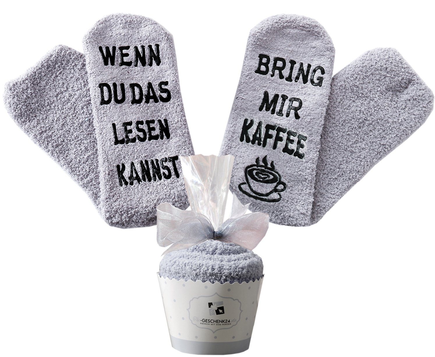 Einzigartige Geschenkideen für Frauen und Männer mit lustigem Kaffee Spruch. Die Socken aus Korallen Samt sind sehr kuschelig und warm.