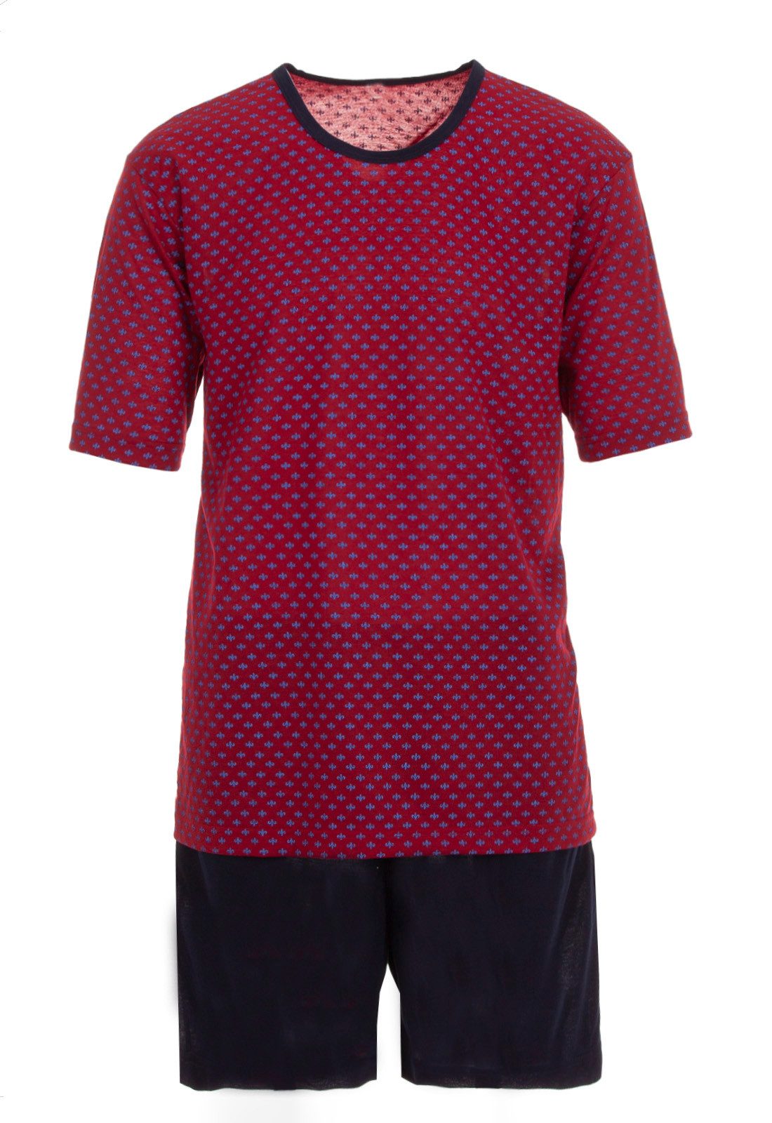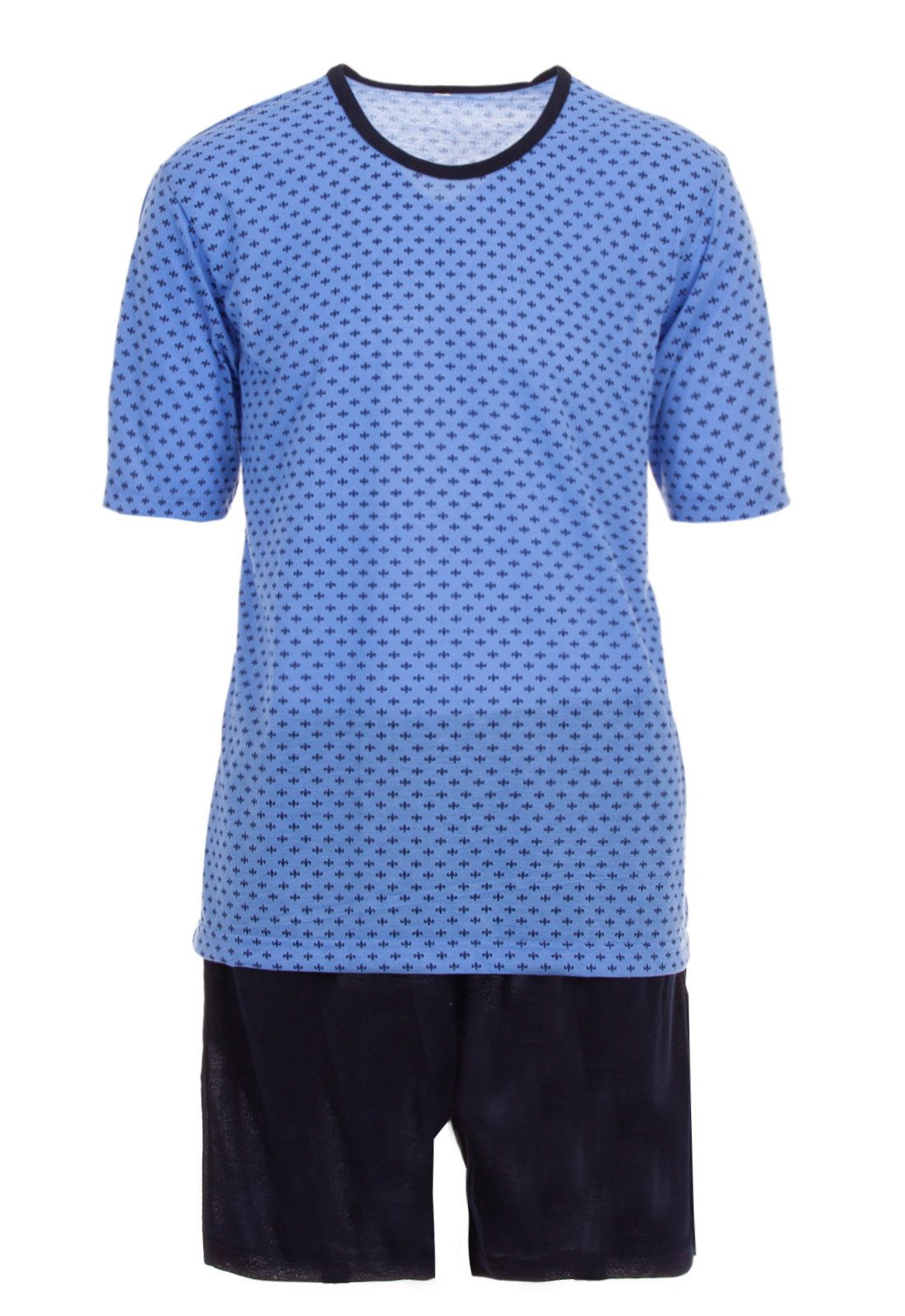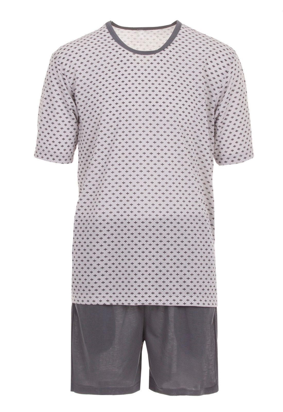 Modischer zeitloser Schlafanzug. Der Herrenschlafanzug ist angenehm auf der Haut zu tragen. Rundhalsausschnitt mit modernem Print. Die kurze unifarbene Schlafanzughose hat einen Dehnbund.