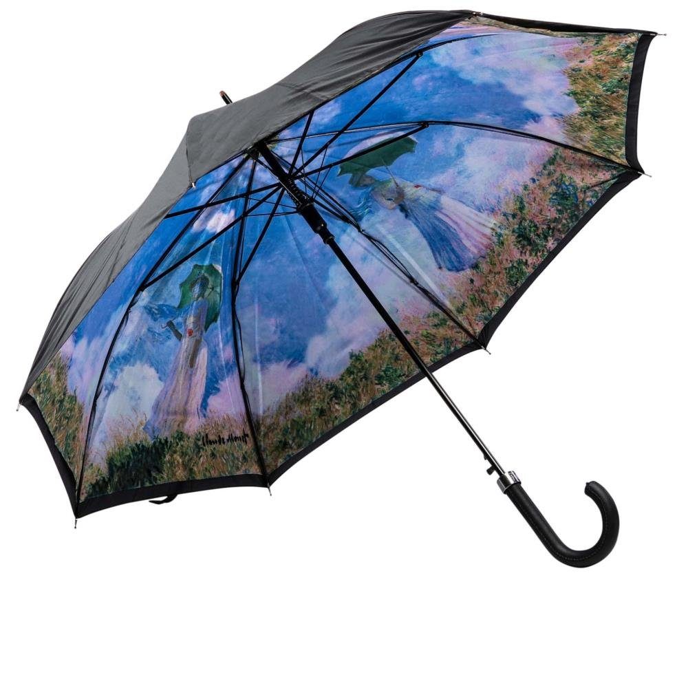 Der bedeutende französische Maler Claude Monet malte 1886 das Motiv Frau mit Sonnenschirm. Das Gemälde zeigt Monets Stieftochter Suzanne Hoschedé. Das Motiv ist in zarten Pastelltönen gehalten und wurde in einer ungewöhnlichen Perspektive mit Blick von unten gemalt. Der äußere Rand ist mit zarten Grün abgesetzt. Dieser Regenschirm mit seinen hellen freundlichen Farben ist ein absolutes Highlight - jeden Tag und bei jeder Wetterlage.