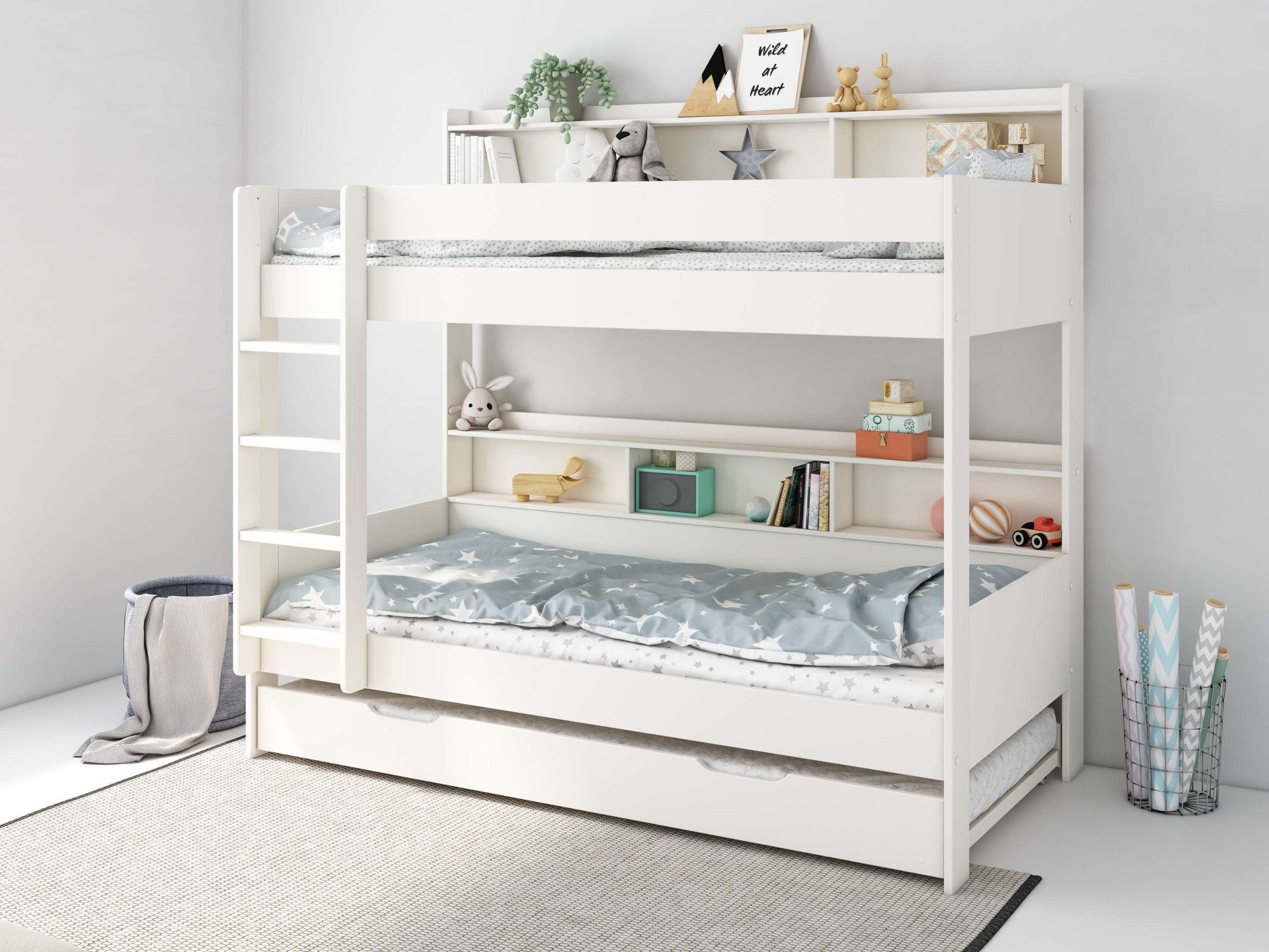Mit Leichtigkeit und spielerisch können Kids mit Hilfe der mitgelieferten Leiter in dieses gemütliche Etagenbett »JAIME, TOPSELLER! Stockbett, mit Regalen, Schublade optional« von Lüttenhütt klettern. Das Etagenbett ist 186,5 cm hoch und hat ein weißes Gestell. Mit 25 cm Bodenfreiheit kann die Fläche unterhalb des Bettes einfach gewischt oder gesaugt werden. Das Material für die Montage ist inklusive, sodass der Gang zum Baumarkt dafür nicht notwendig ist. Das Gestell ist aus massivem und lackiertem Holz gefertigt und damit besonders langlebig. Das Produkt gehört zur Jaime-Serie, die weitere Artikel in diesem Stil enthält. Auch so kannst du ein harmonisches Gesamtbild zaubern.