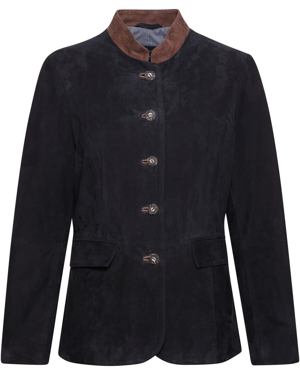 Stilvolle Details und Funktion Mit einem Stehkragen und Paspelknopflöchern, schafft diese elegante Lederjacke eine perfekte Harmonie zwischen Stil und Funktionalität. Die Pattentaschen offerieren genügend Stauraum für alltägliche Gegenstände und sind dabei ein zusätzliches Stilelement. Mit Knöpfen in Hirschhornoptik aus Bein verleiht die Jacke ein Hauch von rustikalem Charme. Ein besonderer Clou ist das Futter in blau-weißem Vichykaro, das für einen überraschenden Farbtupfer sorgt.