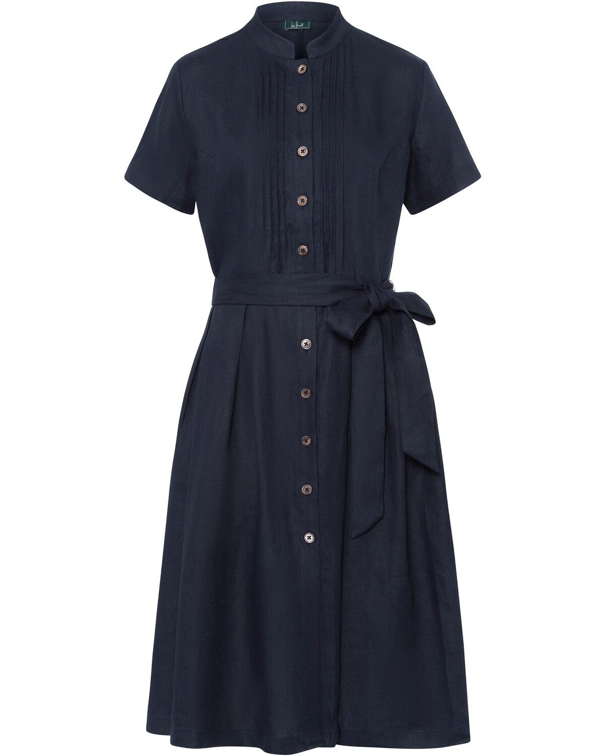 Das Damen Kleid von Luis Steindl aus reinem Leinen verkörpert den zeitlosen Charme des Landhausstils und bietet eine harmonische Kombination aus Eleganz und Bequemlichkeit. Mit seinem ansprechenden Stehkragen und dem separaten Bindegürtel wird die feminine Silhouette gekonnt betont. Die kurzen Ärmel sorgen für eine angenehme Trageweise, während die durchgenöpften Details dem Kleid eine besondere Note verleihen. Der Vorder- und Hinterrock ist mit feinen Falten gestaltet, die dem Kleid eine lebendige Struktur verleihen und gleichzeitig für einen fließenden Fall sorgen. Praktische Taschen in den Seitennähten bieten nicht nur Funktionalität, sondern setzen auch einen lässigen Akzent. Die Biesen entlang der Knopfleiste fügen eine subtile Raffinesse hinzu und harmonieren perfekt mit den Knöpfen in Hirschhornoptik, die dem Gesamtbild eine rustikale Eleganz verleihen. Ideal für verschiedene Anlässe, sei es ein gemütlicher Tag auf dem Land oder ein entspannter Ausflug in die Stadt, passt dieses Kleid sowohl zu flachen Sandalen als auch zu eleganten Schuhen. Die sorgfältige Verarbeitung und die liebevollen Details machen das Damen Kleid von Luis Steindl zu einem zeitlosen Begleiter, der in keiner Garderobe fehlen sollte. Oberstoff: 100% Leinen