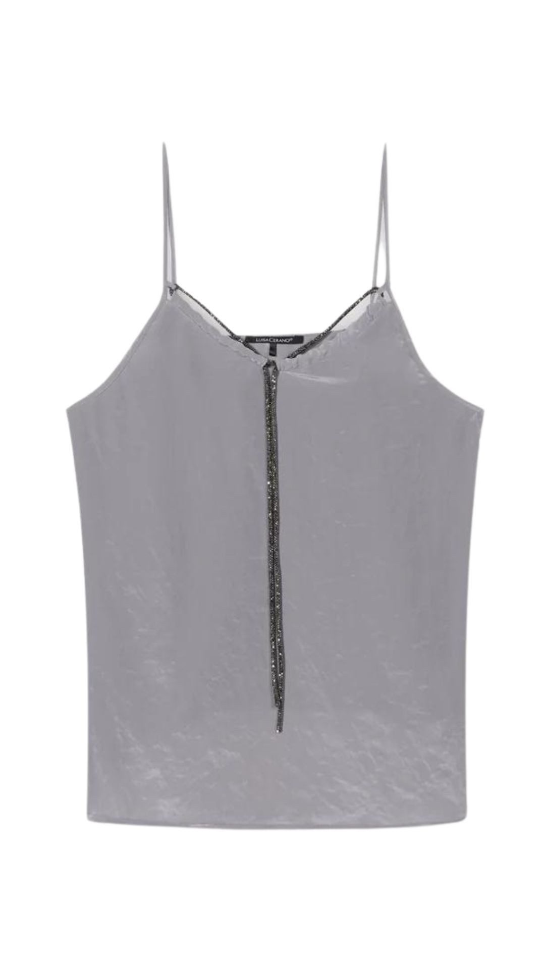 NEU Luisa Cerano NEU . zartes Top, aus fließender Techno-Seide, mit verstellbaren Spaghettiträgern, besonderes Highlight ist das Top mit einer glitzernden Strasskordel dekoriert. . Farbe: grau (0132 silver grey) Material : 100% Polyester