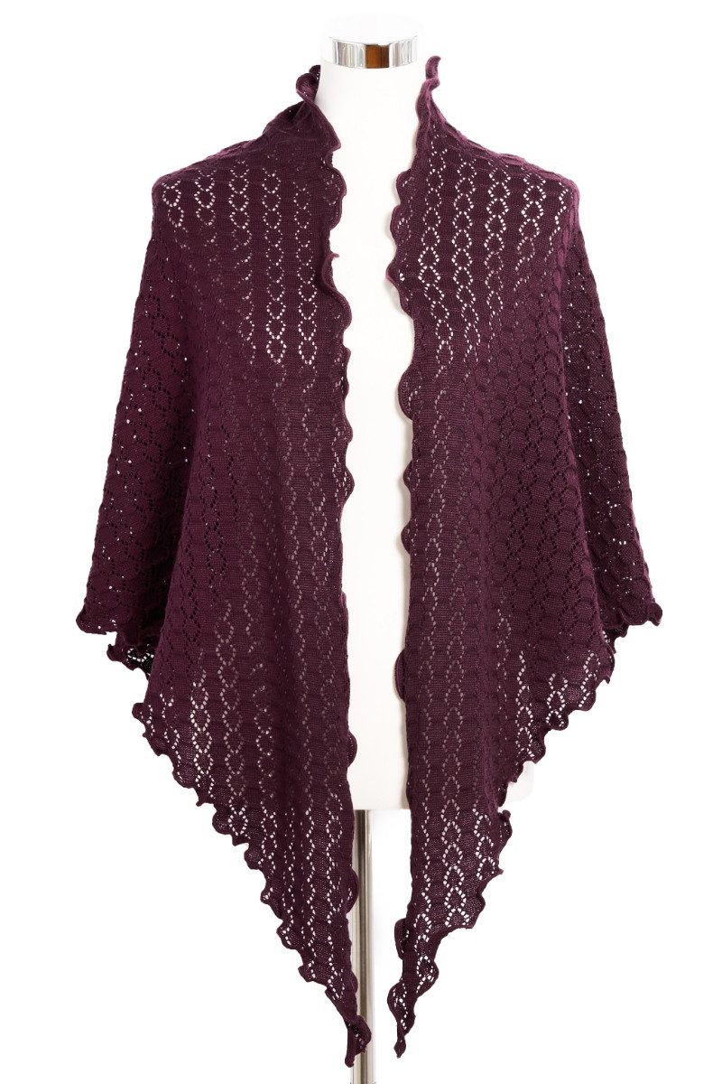 Die traumhafte, dreieckige Trachtenstola in dunklem Weinrot mit angenehmer Baumwolle ist der perfekte Begleiter zum Dirndl und ein schickes Accessoire zu jedem Anlass. Das Trachtentuch mit dem entzückenden, streifenförmig angeordneten Strickmuster aus floral anmutenden Kreisen im Ajour-Style und Sechsecken sowie den dezenten Rüschen an den Kanten hat eine herrlich weiche Stoffqualität und bietet durch den hochwertigen Materialmix einen fantastischen Tragekomfort.