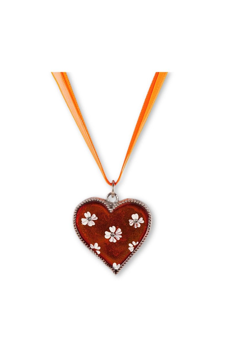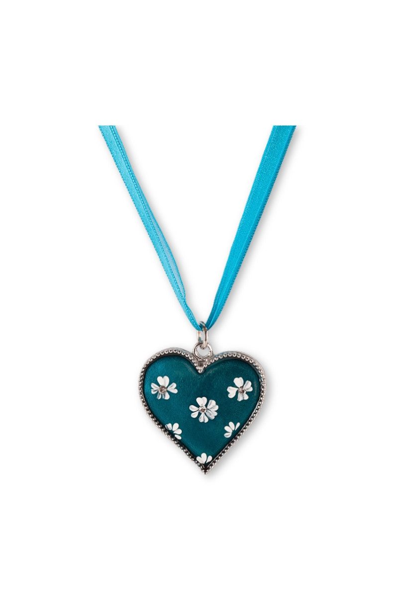 Ganz reizende Trachtenkette, die eine faszinierende Leuchtkraft und einen edlen Glanz besitzt. Frische, sommerliche Farben in Kombination mit den zarten, handgemalten weißen Blüten und glitzernden Swarovskisteinchen, verzaubern Ihr Trachten-Outfit. Dieses romantische Herz wird von einem doppelten Band, bestehend aus einem Satinband und einem Organzaband, getragen.