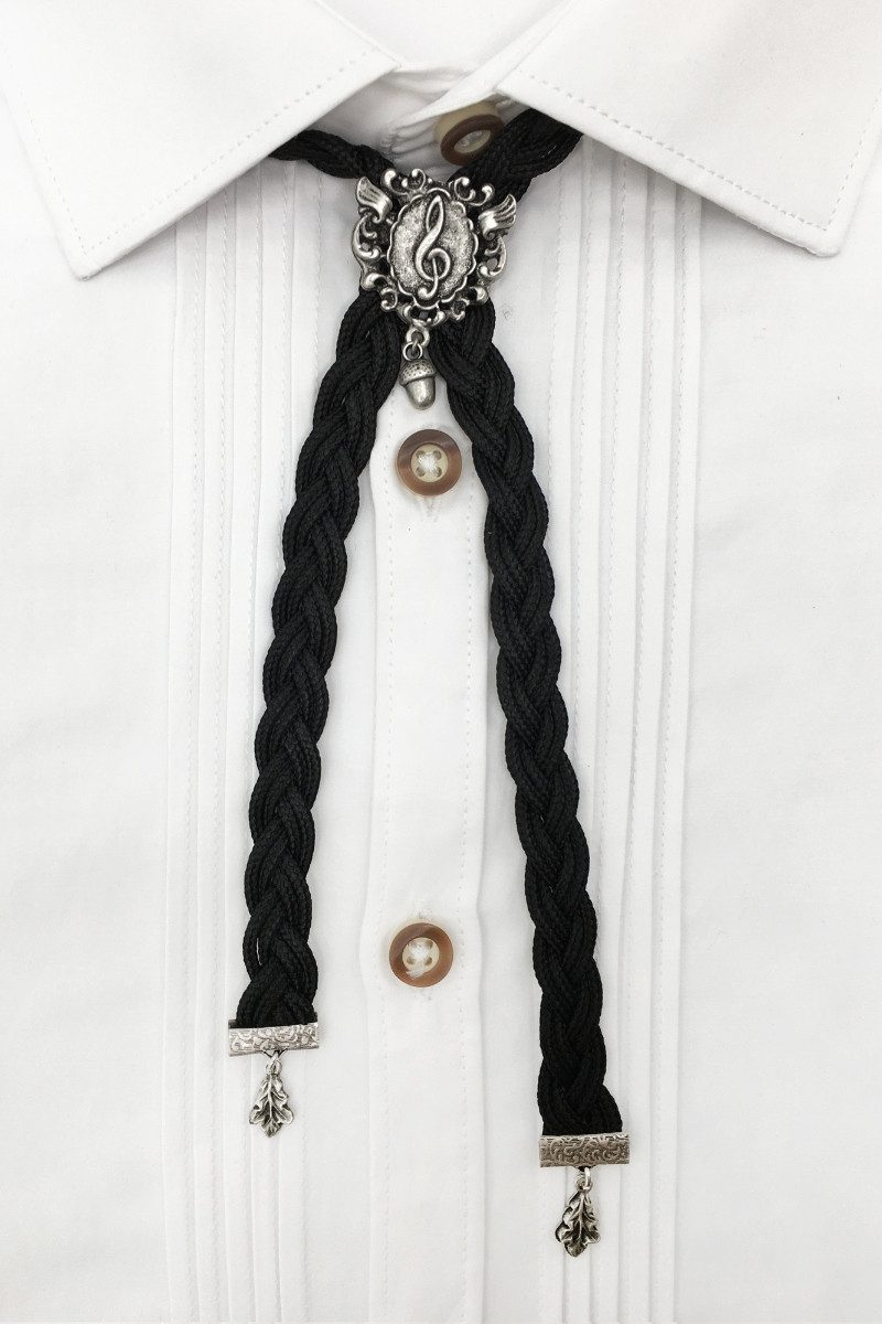 Dieses zünftige Trachtenband "Notenschlüssel" mit der dezent glänzenden, doppelt geflochtenen Kordel mit viel Baumwolle und Kunstseiden-Anteil beeindruckt mit einem schmucken Metallschieber in 3D in Altsilber, versehen mit einem Notenschlüssel, einem Ornamentik-Rahmen und einem kleinen Eichel-Anhänger. Die Bandenden sind mit fein gemusterten Metallhülsen versehen, an denen beweglich kleine Eichenblätter-Anhänger in Altsilber befestigt sind. Das Trachtenband ist REACH-konform und erweist sich als grandioser Blickfang für jedes Trachten-Outfit.