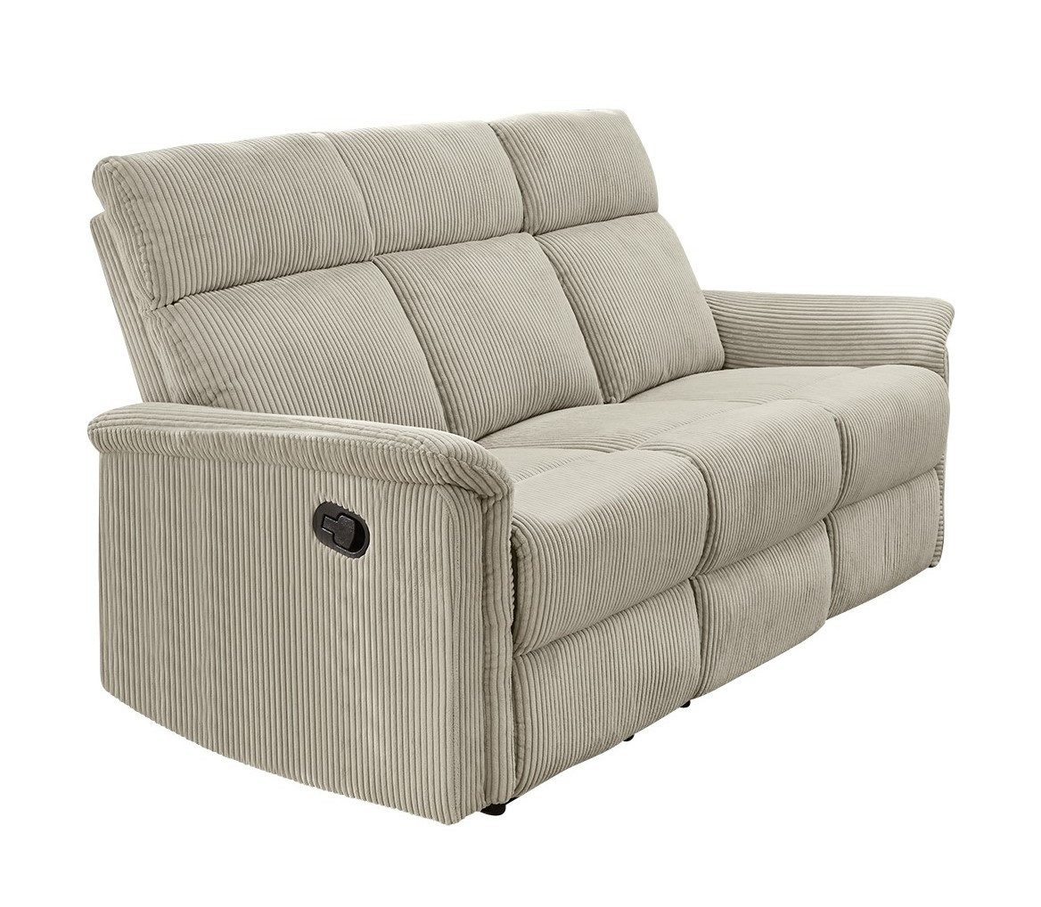 Wissenswertes | Das Relaxsofa besitzt ergonomisch geformte Sitze, die ein entspanntes Sitzen für drei Personen ermöglichen. Dank der halbautomatischen Relax-Funktion (nicht elektrisch) lassen sich die zwei äußeren Plätze in unterschiedliche Positionen bringen bis zur angenehmen Liegeposition, die zum Erholen einlädt. Die Federkernpolsterung und Wellenunterfederung bietet optimalen Sitzkomfort. Der pflegeleichte beige Cordstoff ist angenehm und zeitlos. Der Rücken ist echt bezogen. Passend dazu ist ein Sessel und Zweisitzer-Relaxsofa erhältlich. |