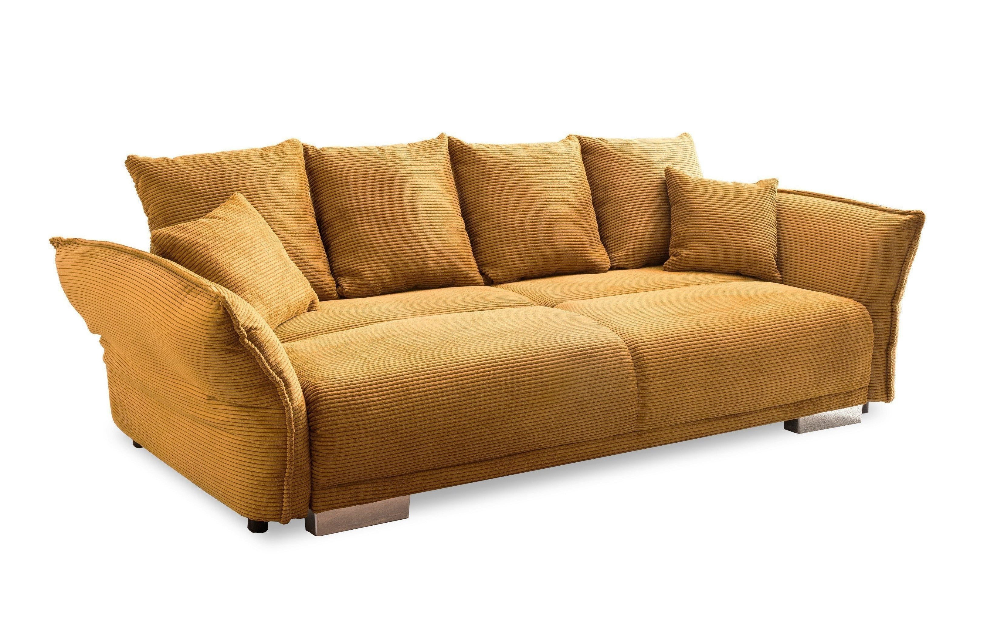 Wissenswertes | Das gemütliche Big-Sofa mit seinen rasterlos verstellbaren Armlehnen besitzt einen angenehmen und sehr bequemen Sitz- und Liegekomfort durch seine hochwertige Federkernpolsterung mit Wellenunterfederung. Es ist das perfekte Gästebett für Familie und Freunde und enthält dazu einen geräumigen Bettkasten. Der Auszug zur Schlaffunktion ist sehr leichtgängig durch eine Liftunterstützung zu bedienen. Der Rücken ist ebenfalls mit dem schönen Cordstoff echt bezogen, sodass das Sofa frei im Raum stellbar ist. |