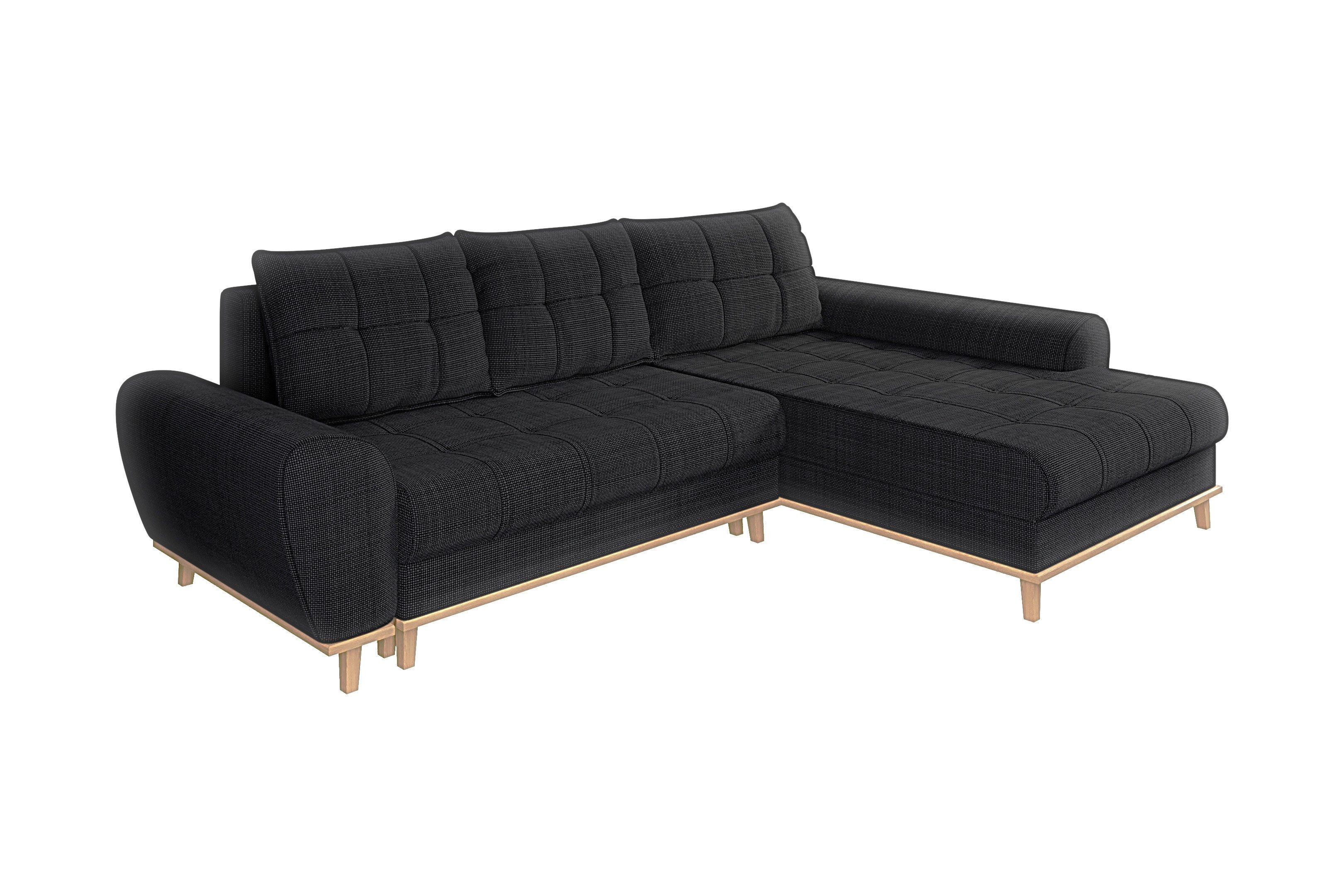 Wissenswertes | Dieses bequeme Ecksofa im Scandi-Stil beeindruckt auf den ersten Blick durch den angenehm weichen Bouclé Chenille Stoff und die attraktive Steppung im Bezug in Kombination mit den schlanken Füßen und der umlaufenden Blende aus hellem Massivholz. Der hochwertige Bezugsstoff ist pflegeleicht und wasserabweisend! Das Sofa besitzt eine perfekte Gästebettfunktion für Freunde und Familie und viel Stauraum durch einen großen Bettkasten. Die Ottomane ist bei Draufsicht rechts montierbar. Der Rücken ist echt bezogen, sodass das Sofa frei im Raum stellbar ist. |