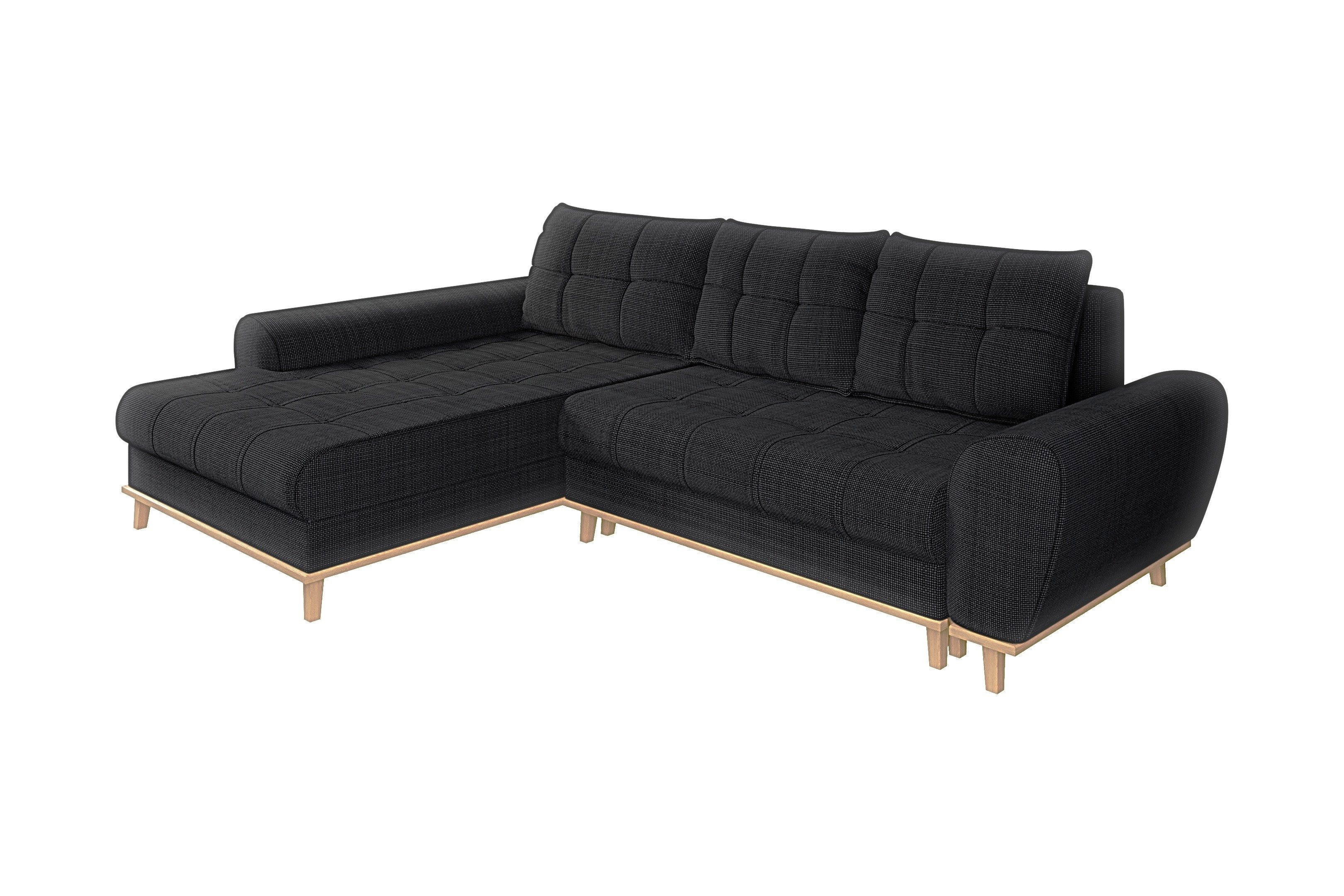 Wissenswertes | Dieses bequeme Ecksofa im Scandi-Stil beeindruckt auf den ersten Blick durch den angenehm weichen Bouclé Chenille Stoff und die attraktive Steppung im Bezug in Kombination mit den schlanken Füßen und der umlaufenden Blende aus hellem Massivholz. Der hochwertige Bezugsstoff ist pflegeleicht und wasserabweisend! Das Sofa besitzt eine perfekte Gästebettfunktion für Freunde und Familie und viel Stauraum durch einen großen Bettkasten. Die Ottomane ist bei Draufsicht links montierbar. Der Rücken ist echt bezogen, sodass das Sofa frei im Raum stellbar ist. |