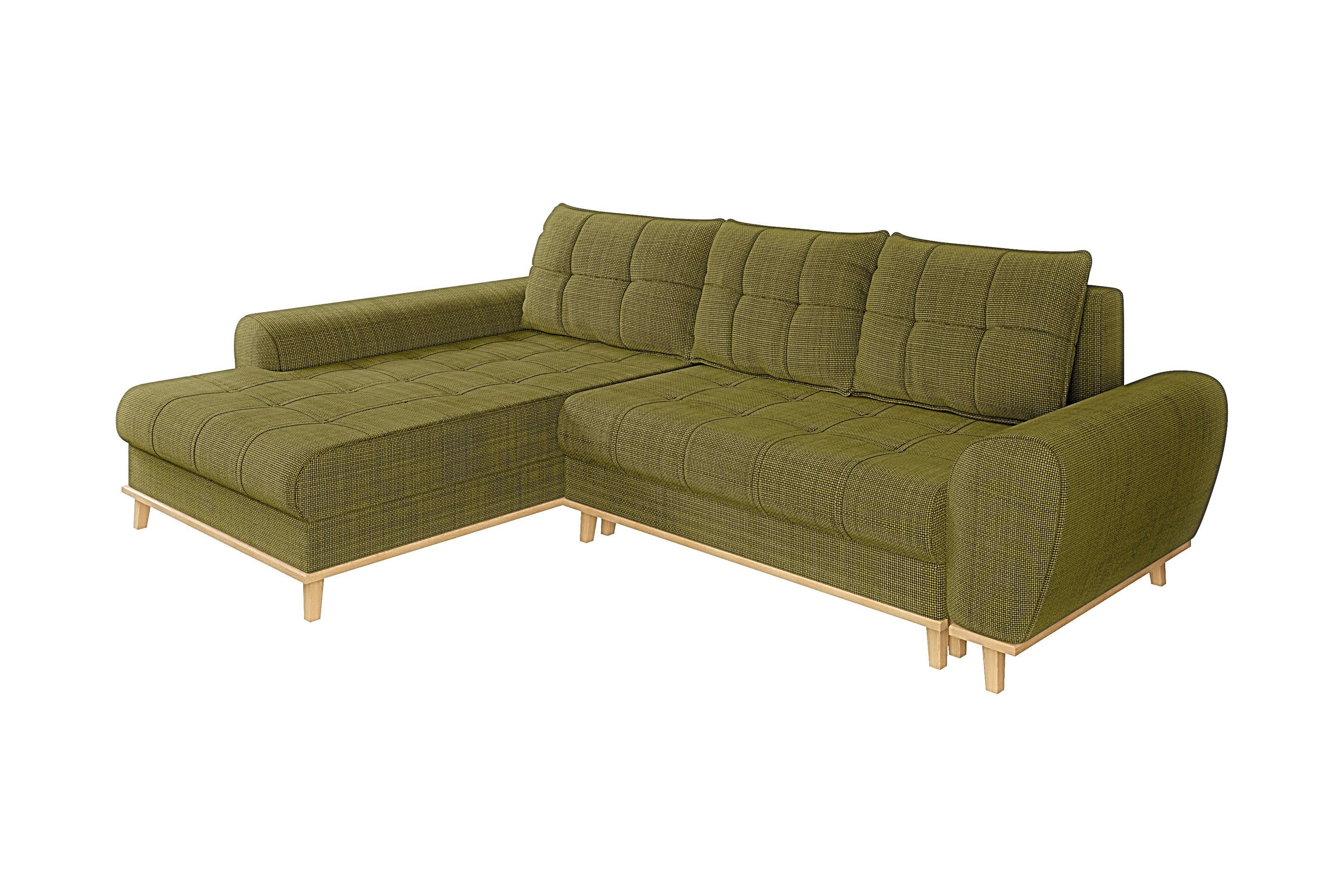 Wissenswertes | Dieses bequeme Ecksofa im Scandi-Stil beeindruckt auf den ersten Blick durch den angenehm weichen Bouclé Chenille Stoff und die attraktive Steppung im Bezug in Kombination mit den schlanken Füßen und der umlaufenden Blende aus hellem Massivholz. Der hochwertige Bezugsstoff ist pflegeleicht und wasserabweisend! Das Sofa besitzt eine perfekte Gästebettfunktion für Freunde und Familie und viel Stauraum durch einen großen Bettkasten. Die Ottomane ist bei Draufsicht links montierbar. Der Rücken ist echt bezogen, sodass das Sofa frei im Raum stellbar ist. |