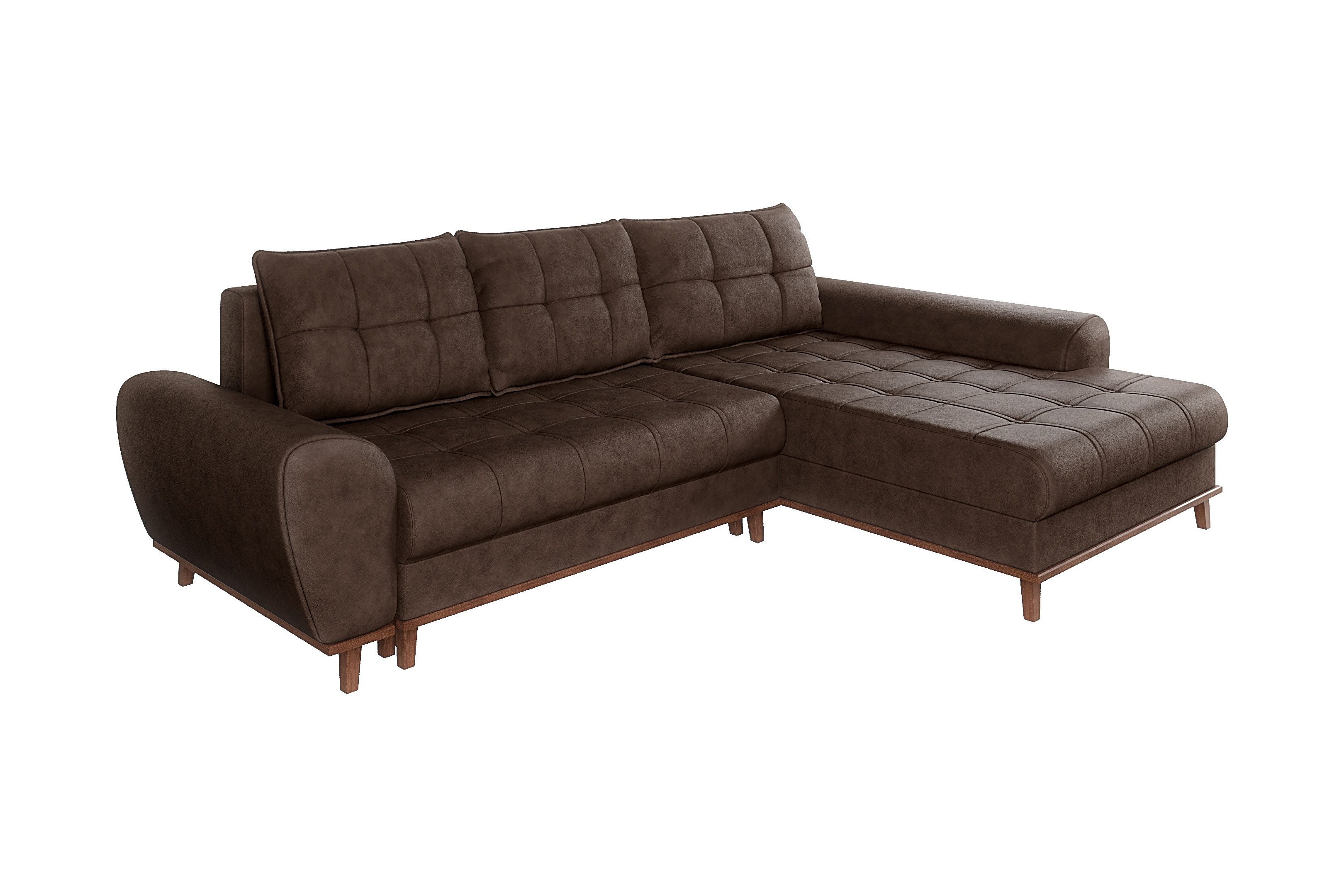 Wissenswertes | Dieses bequeme Ecksofa in Leder-Optik beeindruckt auf den ersten Blick durch den angesagten Vintage-Look des weichen Mikrofaserbezugs mit attraktiver Steppung in Kombination mit den schlanken Füßen und der umlaufenden Blende aus dunklem Massivholz. Der pflegeleichte Bezugsstoff ist strapazierfähig, leicht zu reinigen und hat eine angenehme Haptik. Das Sofa besitzt eine perfekte Gästebettfunktion für Freunde und Familie und viel Stauraum durch einen großen Bettkasten. Die Ottomane ist bei Draufsicht rechts montierbar. Der Rücken ist echt bezogen, sodass das Sofa frei im Raum stellbar ist. |