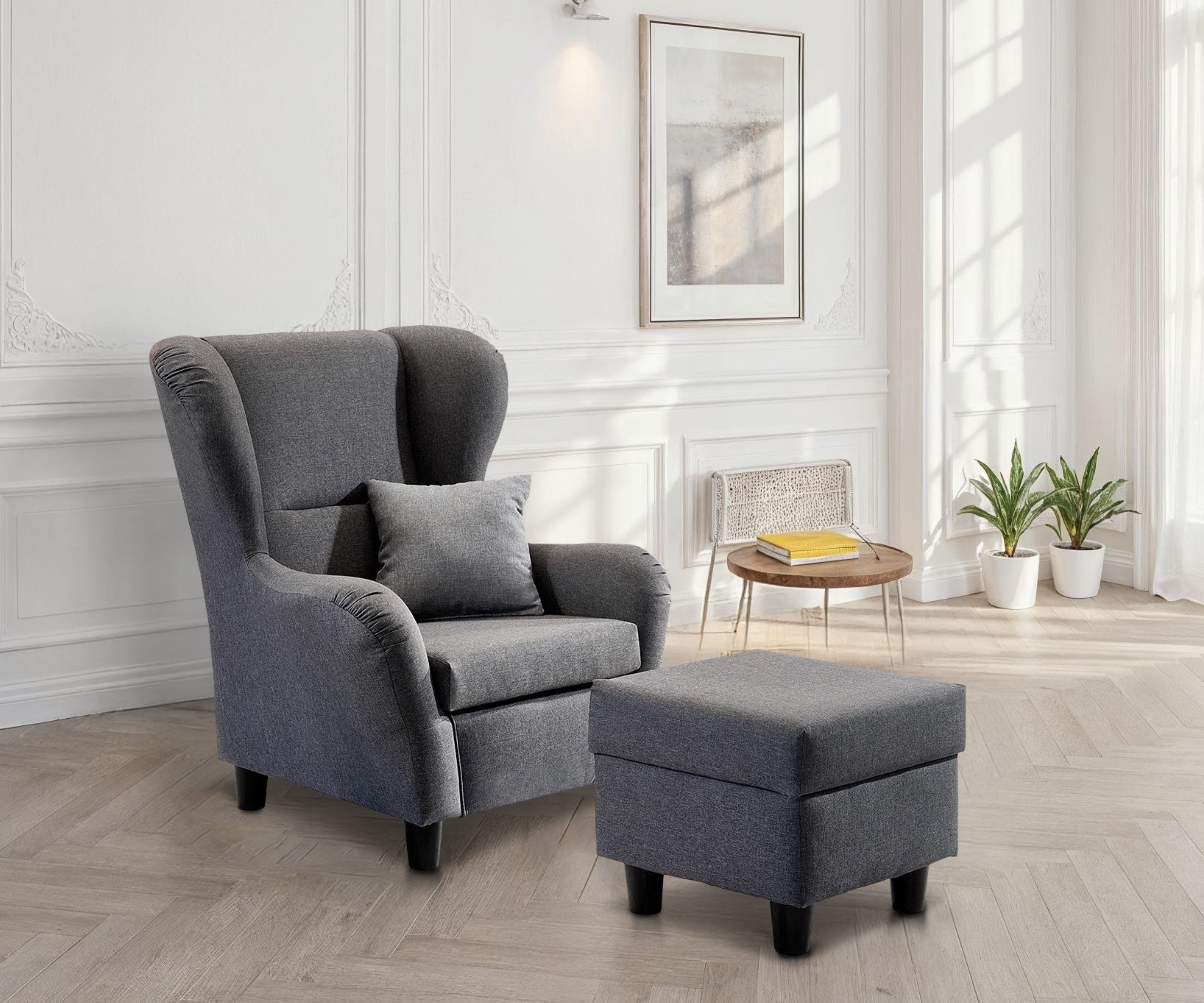 Lieferumfang | 1x Ohrensessel 1x Hocker 1x Zierkissen |