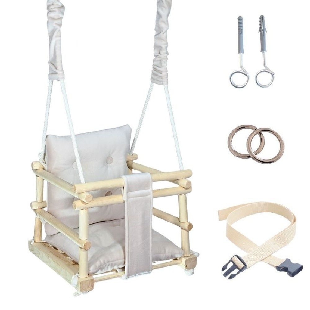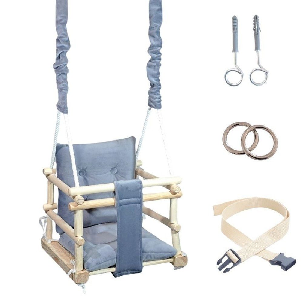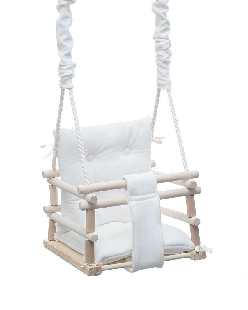 Die Schaukel ist mit gesteppten, farbenfrohen Kissen ausgestattet, die in der Waschmaschine gewaschen werden können. Hergestellt aus superweichem Velours (100 % Polyester), gefüllt mit antiallergener Silikonwatte – für besten Komfort und Sicherheit.