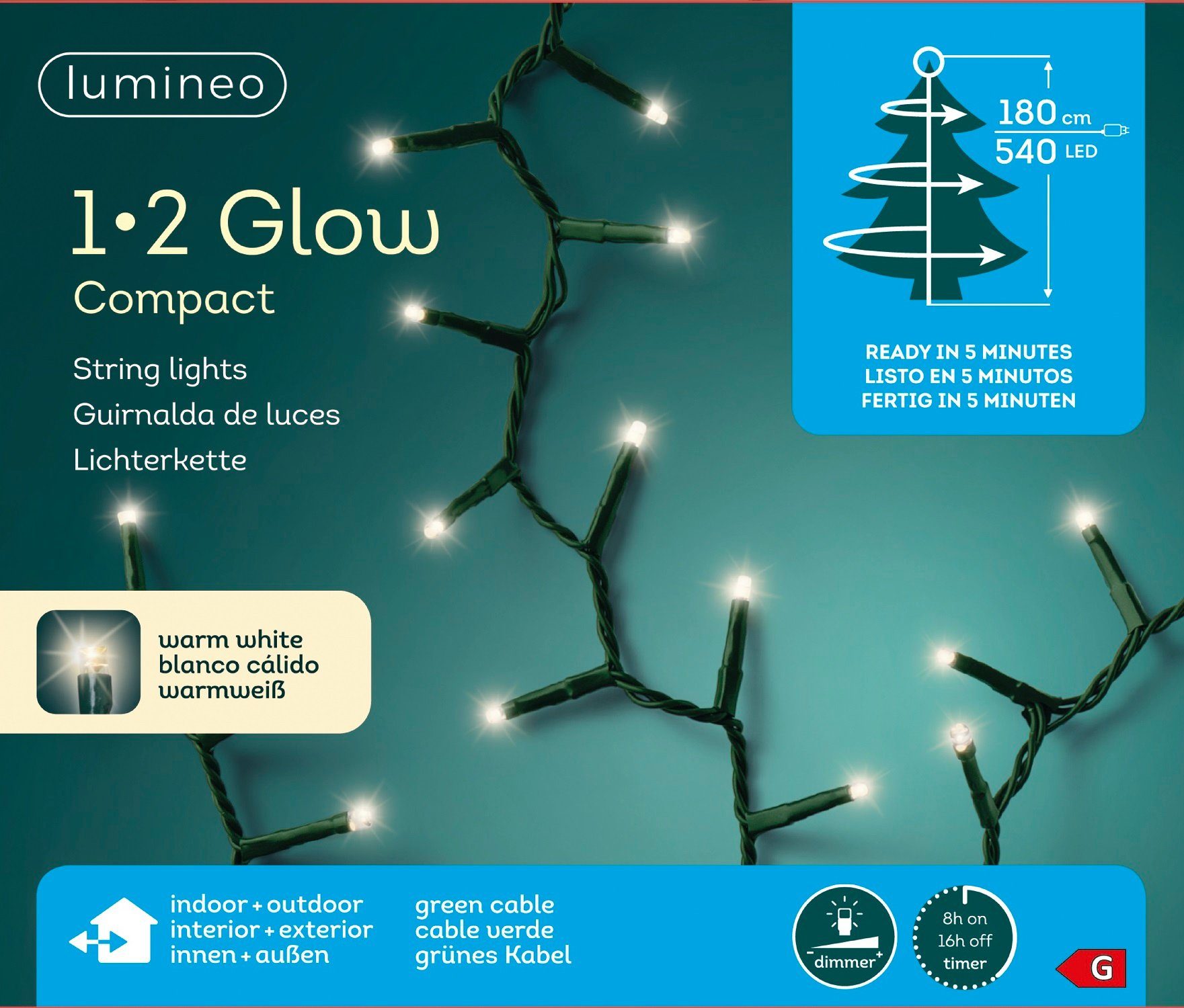 Die Lichterkette verfügt über 540 LEDs die in einem warm weißen Ton erstrahlt. Das grüne Kabel fügt sich nahtlos in den Weihnachtsbaum ein und lässt die Lichter in voller Pracht erstrahlen. Die Beleuchtung ist für Weihnachtsbäume bis zu einer Höhe von 1,8 m geeignet. Die LEDs sind auf 6 Strängen mit folgenden Длинаn aufgeteilt: 3,5 m, 3 m, 2,5 m, 2 m, 1,5 m und 1 m. Befestigt wird sie mit einem Gummi-Ring oben am Baum. Die Dimm-Funktion ermöglicht es, die Helligkeit nach Belieben in 5 unterschiedlichen Stufen anzupassen. Dank der praktischen Timer-Funktion lässt sich die Lichterkette ganz bequem steuern, sodass sie automatisch 8 Stunden lang eingeschaltet und 16 Stunden ausgeschaltet ist. Diese Funktion spart nicht nur Energie, sondern sorgt auch dafür, dass die Lichterkette jeden Tag zur gleichen Zeit erstrahlt. Die Beleuchtung bietet zudem eine großzügige 5 m lange Zuleitung, wodurch die LED-Kette eine Gesamtlänge von 6,8 m besitzt. Mit dem IP44-Schutz ist sie Wetterbeständig und somit gegen Spritzwasser geschützt. Sie ist für den Innen- und Außenbereich geeignet.