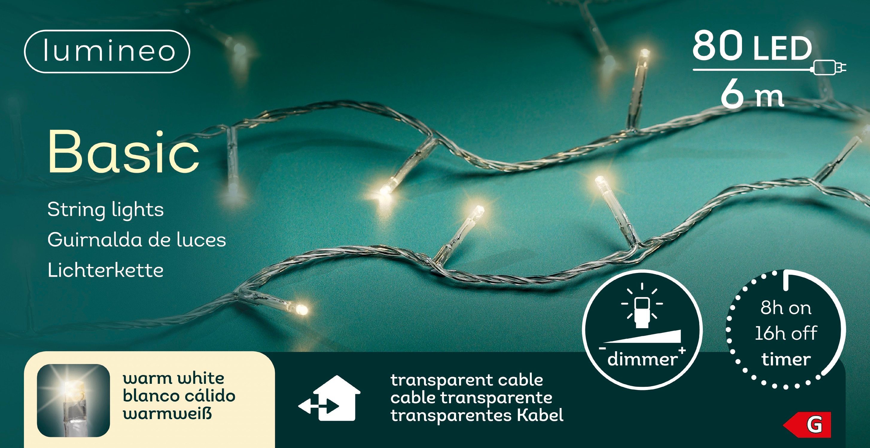 Die Lichterkette verfügt über 80 LEDs, welche in einem warm weißen Ton erstrahlen. Die 5 Stufen-Dimm-Funktion ermöglicht es, die Helligkeit nach Belieben anzupassen und somit die perfekte Atmosphäre zu schaffen. Dank der praktischen Timer-Funktion lässt sich die Lichterkette ganz bequem steuern, sodass sie automatisch 8 Stunden lang eingeschaltet und 16 Stunden ausgeschaltet ist. Diese Funktion spart nicht nur Energie, sondern sorgt auch dafür, dass die Lichterkette jeden Tag zur gleichen Zeit erstrahlt. Die Beleuchtung bietet zudem eine zusätzliche 5 m lange Zuleitung, wodurch die Lichterkette eine Gesamtlänge von 11 m besitzt. Mit dem IP44-Schutz ist sie Wetterbeständig und somit gegen Spritzwasser geschützt. Sie ist für den Innen- und Außenbereich geeignet. Mit CE-Gütesiegel ausgezeichnet. Das Kabel ist transparent.